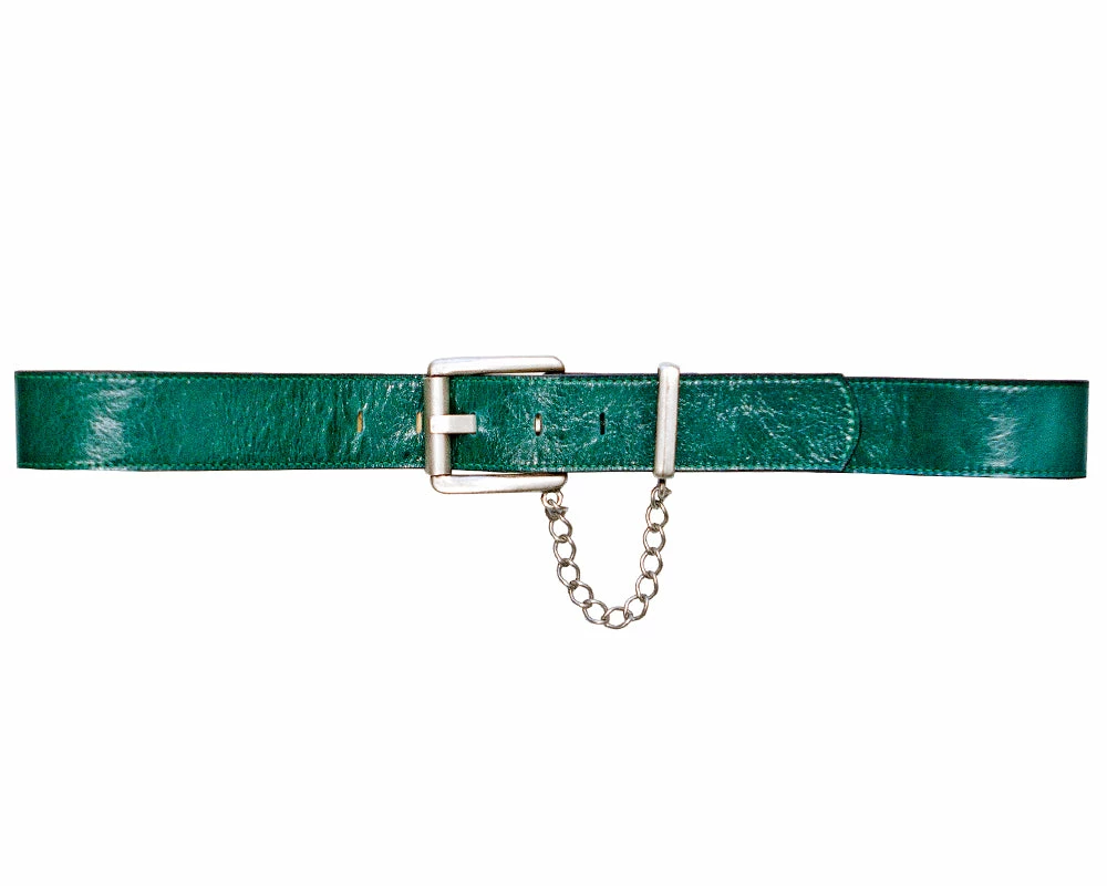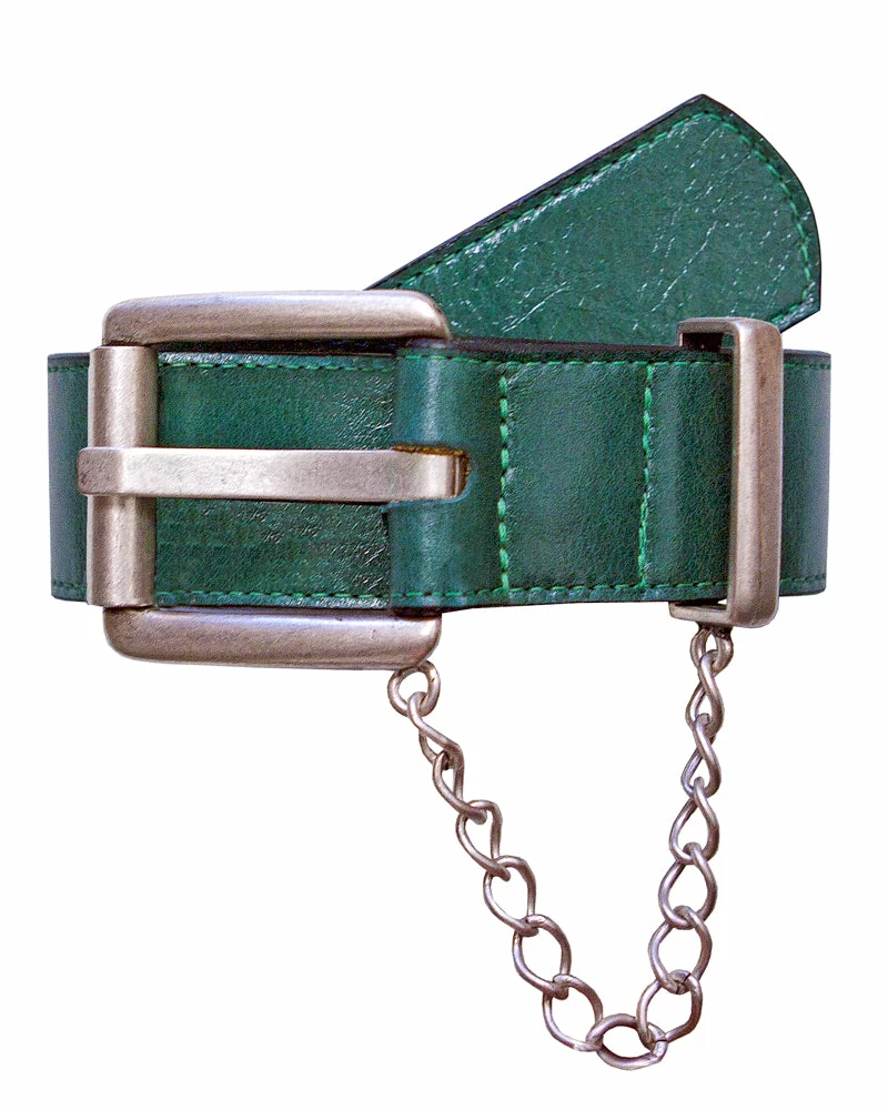 Emerald green pops on this belt, finished with a small swag chain.Â
