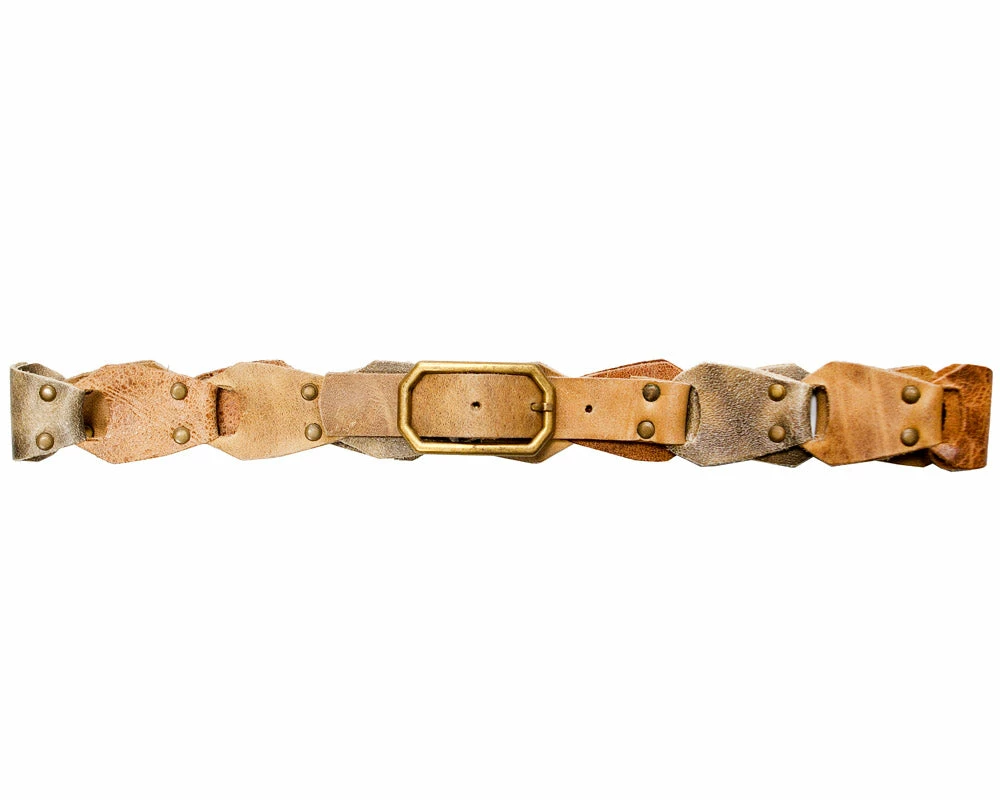 Links of leather are riveted together to form the strap of this belt. An unusual buckle adds the finishing touch on a unique style.