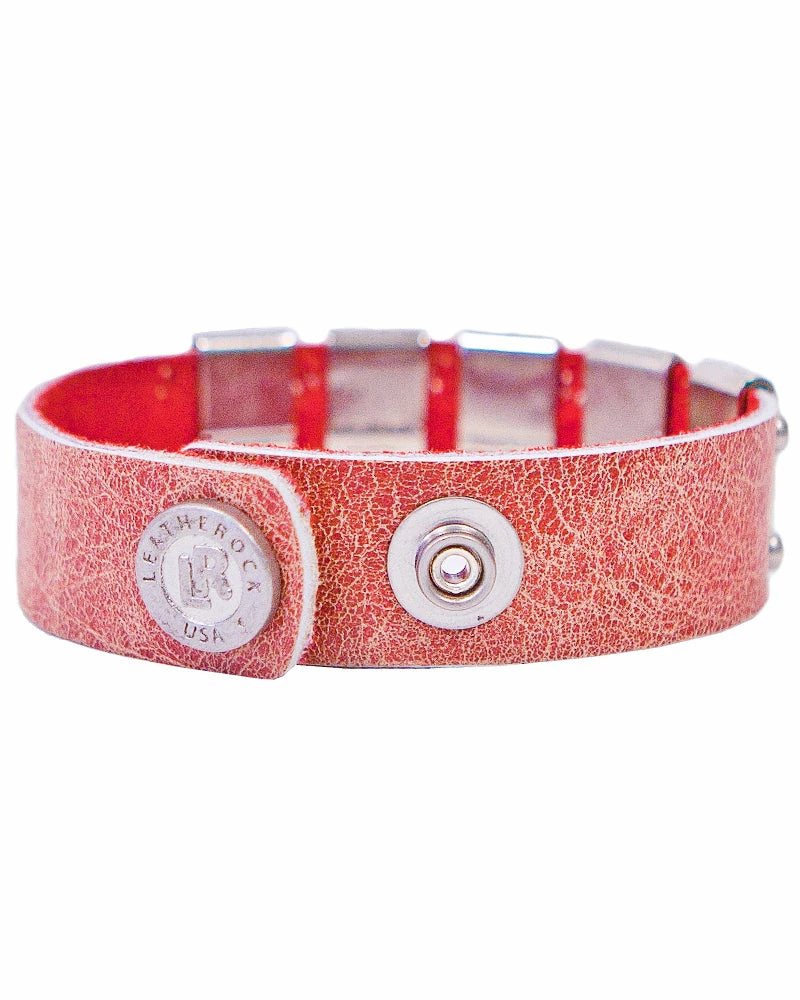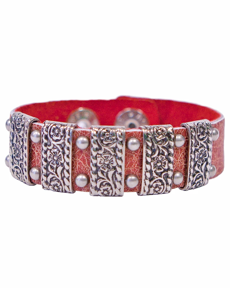 Tawny red leather frames tiny flowers on silver sliders.Â