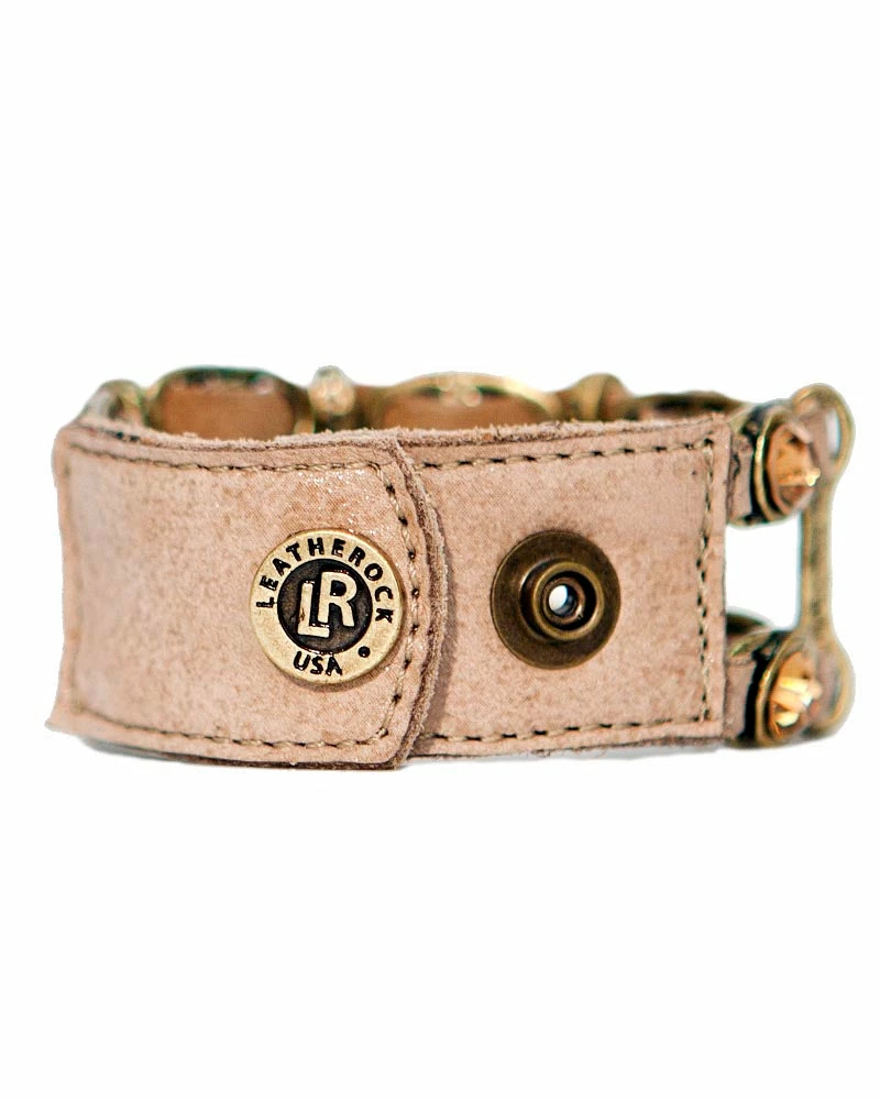 Beautiful faceted crystals sparkle while hammered hardware brings texture to this leather bracelet.Â