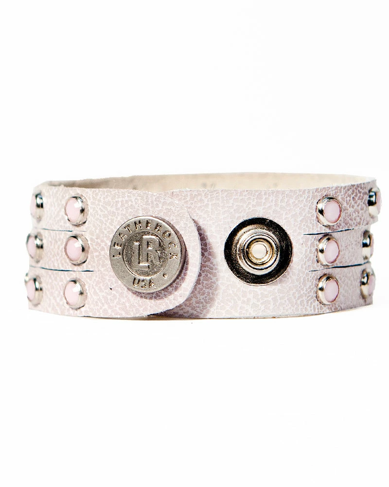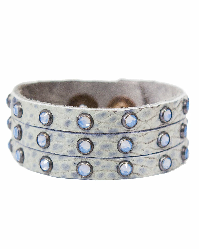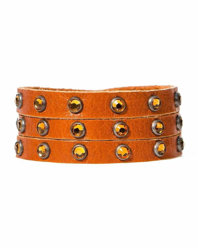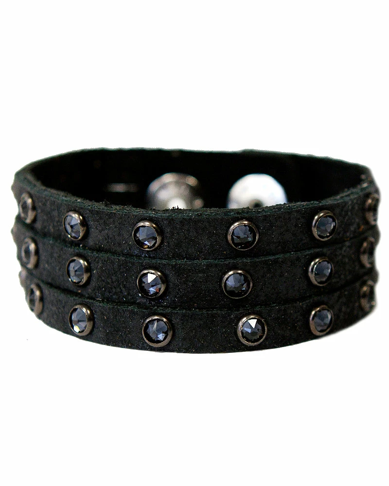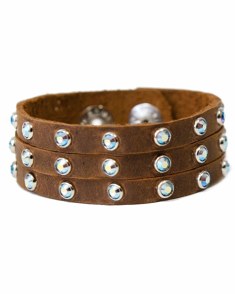 Three strands of leather are dotted with sparkling crystals to form this stacked-illusion cuff.Â