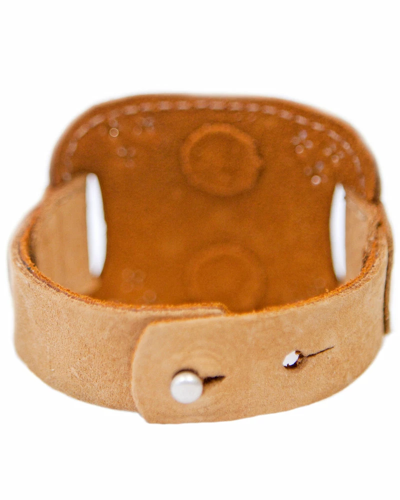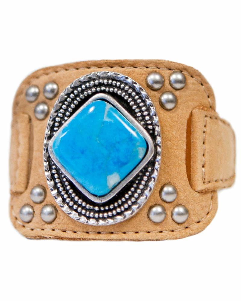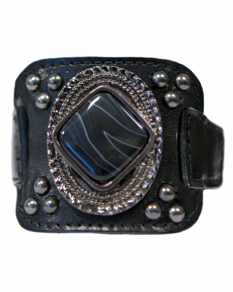 The centerpiece of this leather bracelet is a beautiful stone, accented by hardware and studs.