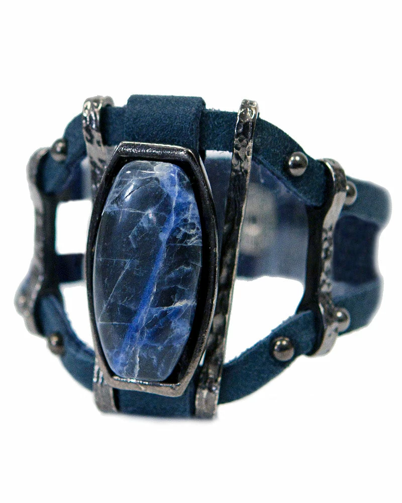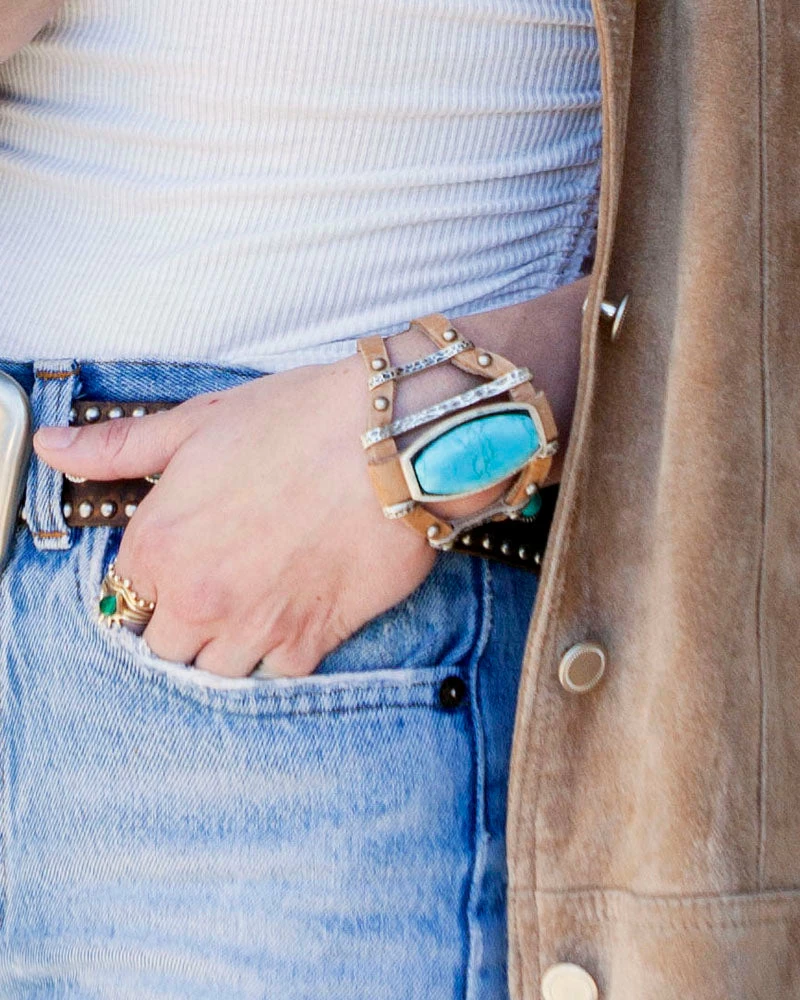 The natural stone centerpiece steals the show on this studded leather bracelet.Â