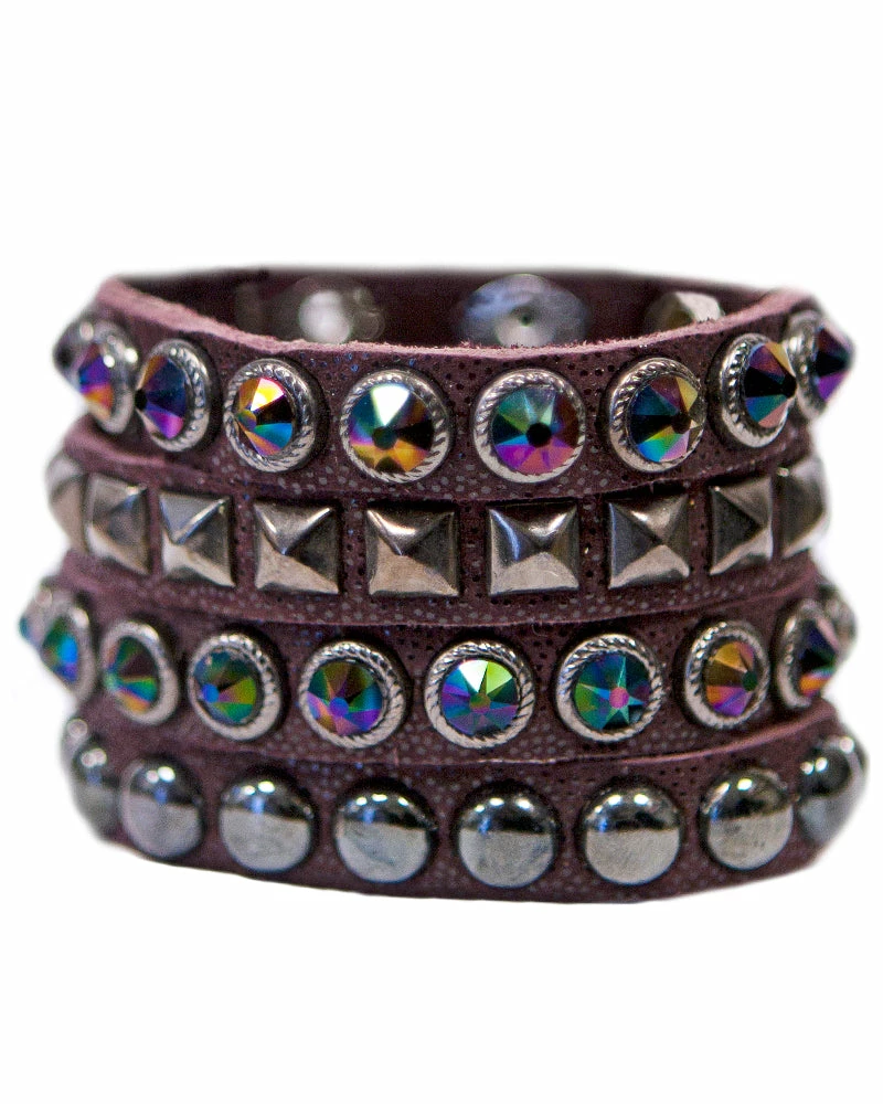 This statement bracelet is adorned with shimmering crystals and studs to accent the printed leather band.Â