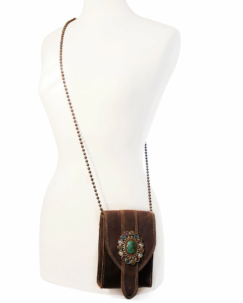 This leather box bag features a floral inspired ornament with semi-precious stone center and crystals.
