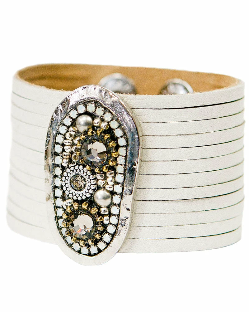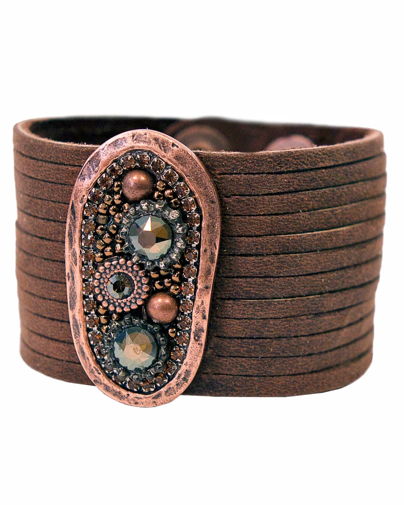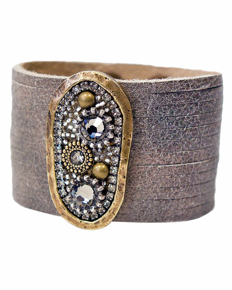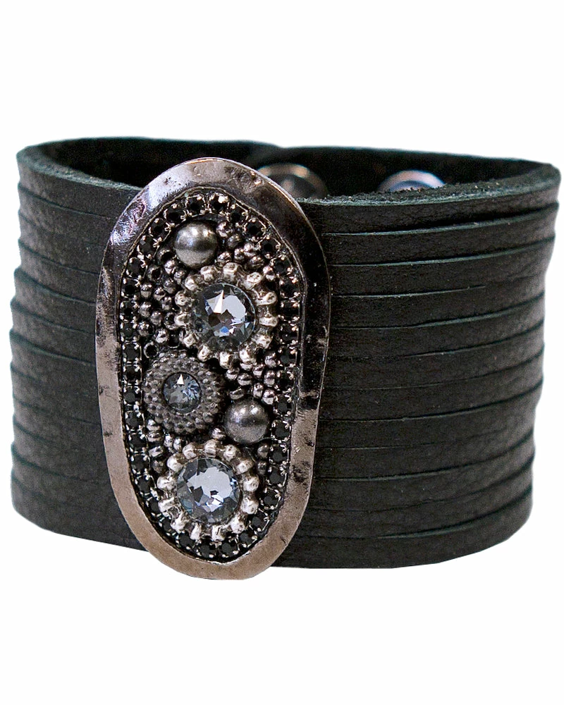 The hand-placed details of this bracelet make each one unique. The ornament features sparkling crystals and small beads, on a leather cuff.