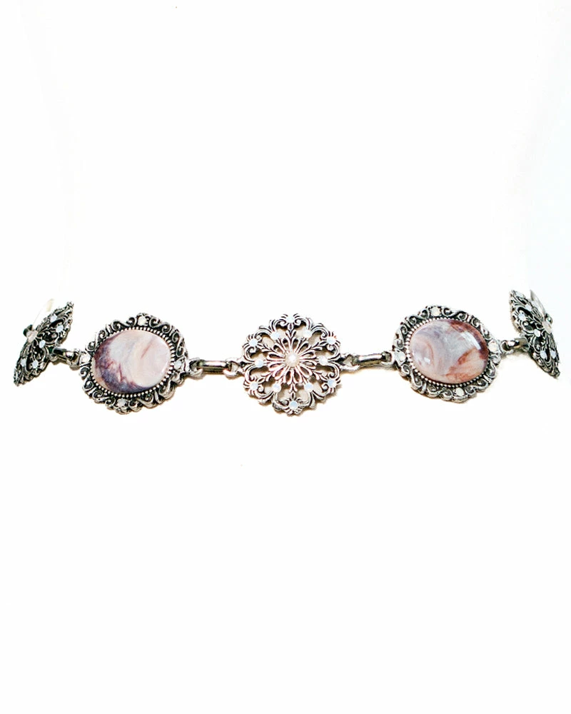 This belt brings vintage to life with ornate hardware and colored stones. An elastic strap adds versatility.Â