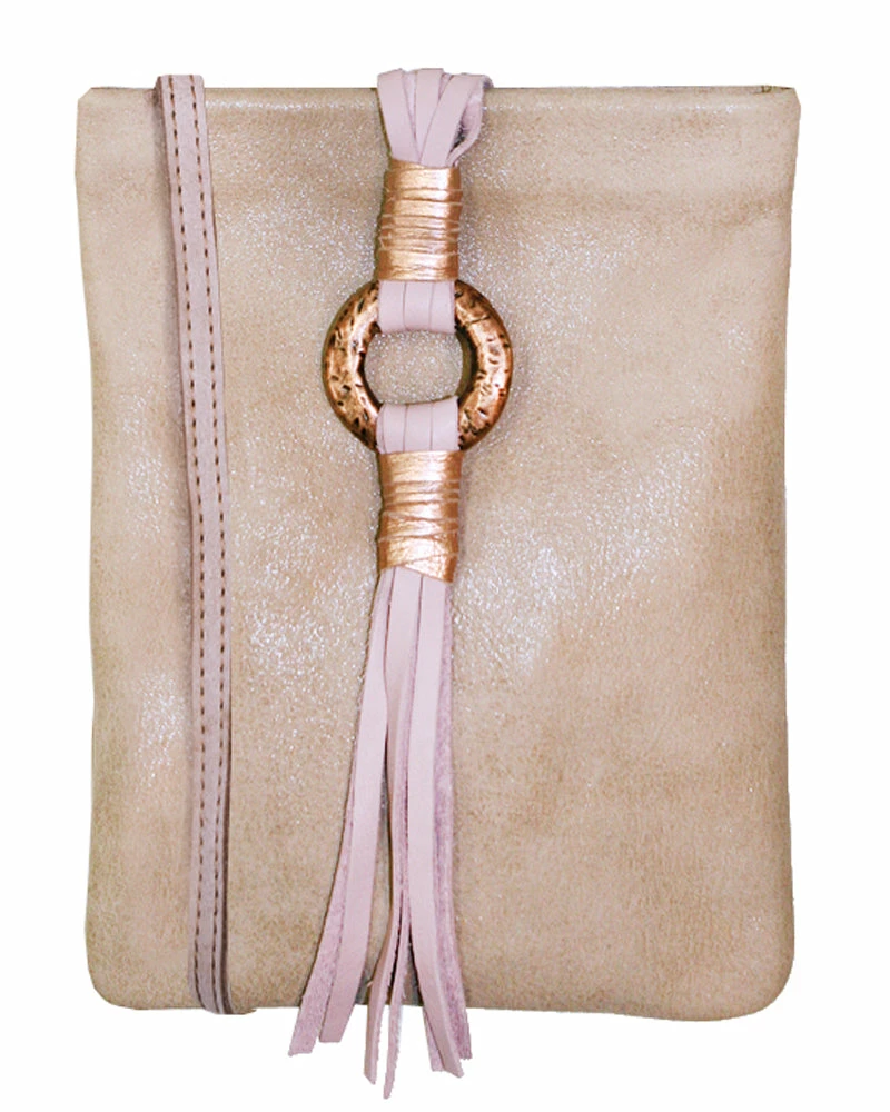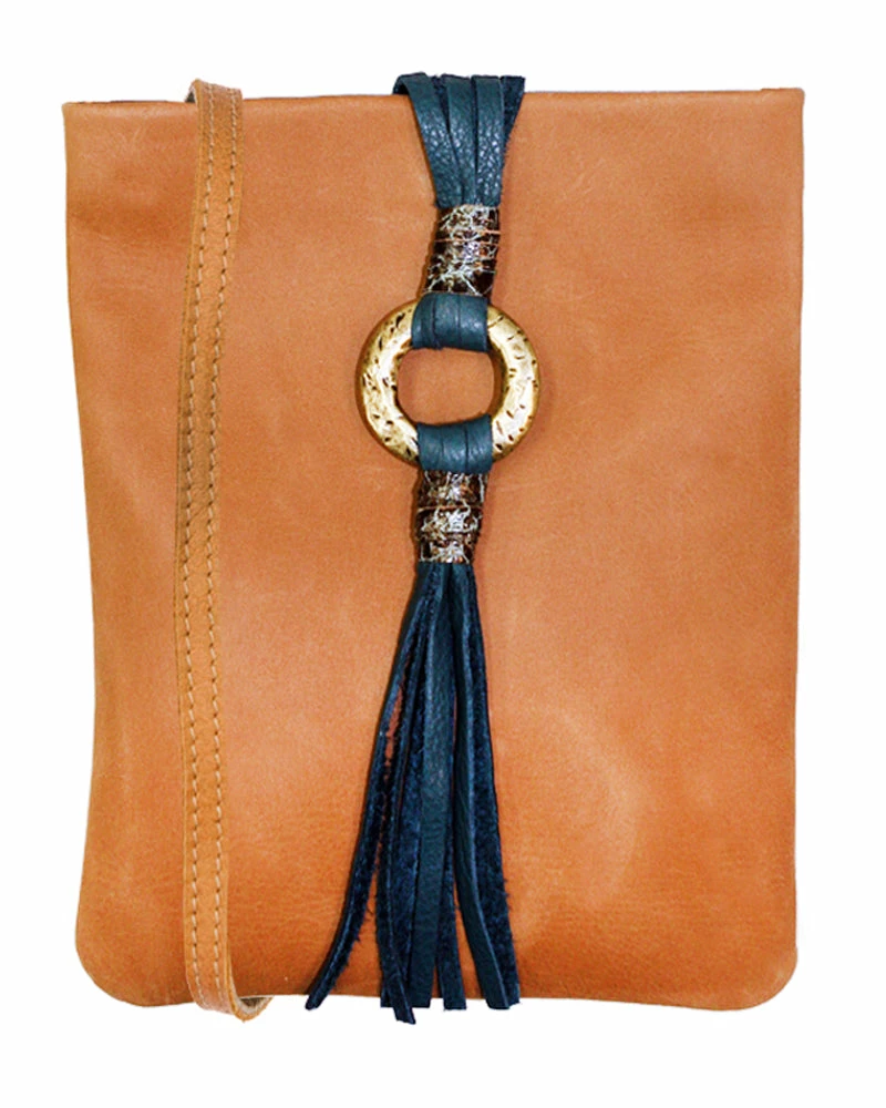 A swinging tassel hanging on a hammered ring add a touch of fun to this cell phone pouch, crossbody bag.