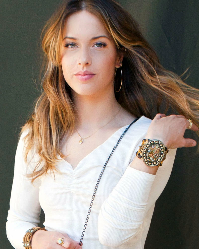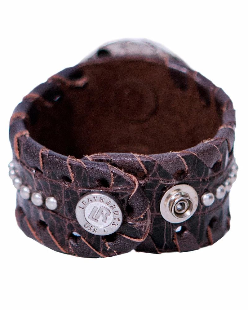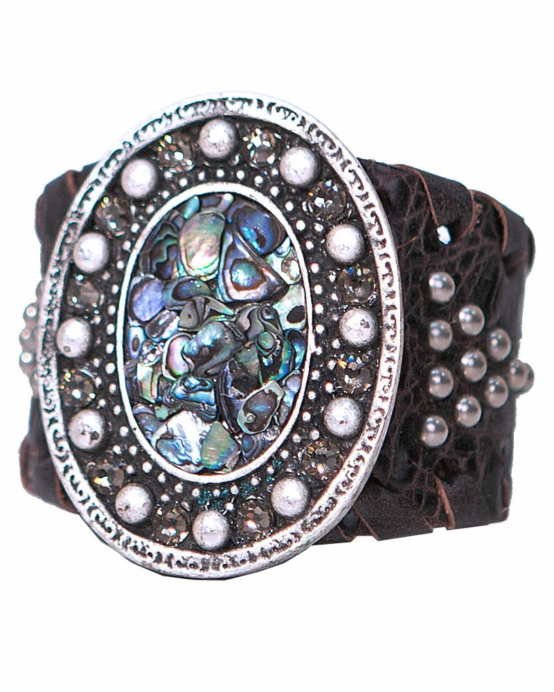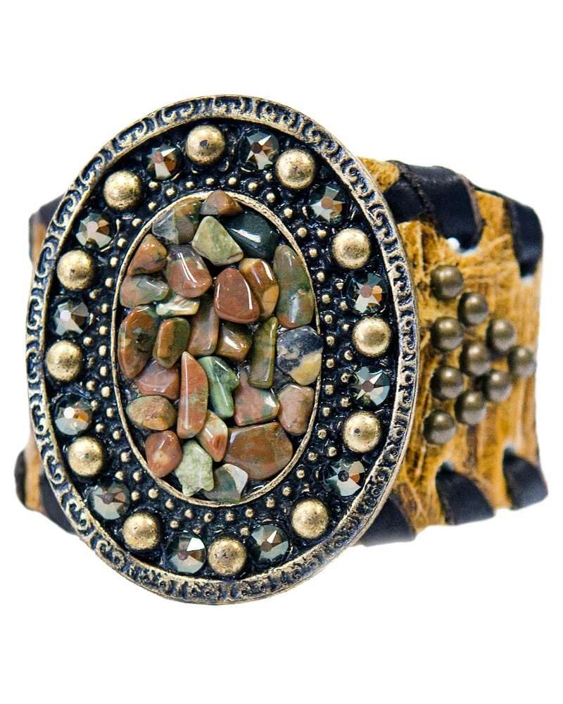 This wide cuff features a centerpiece of semi-precious chips and crystals. Studs and lacing add the finishing touch.