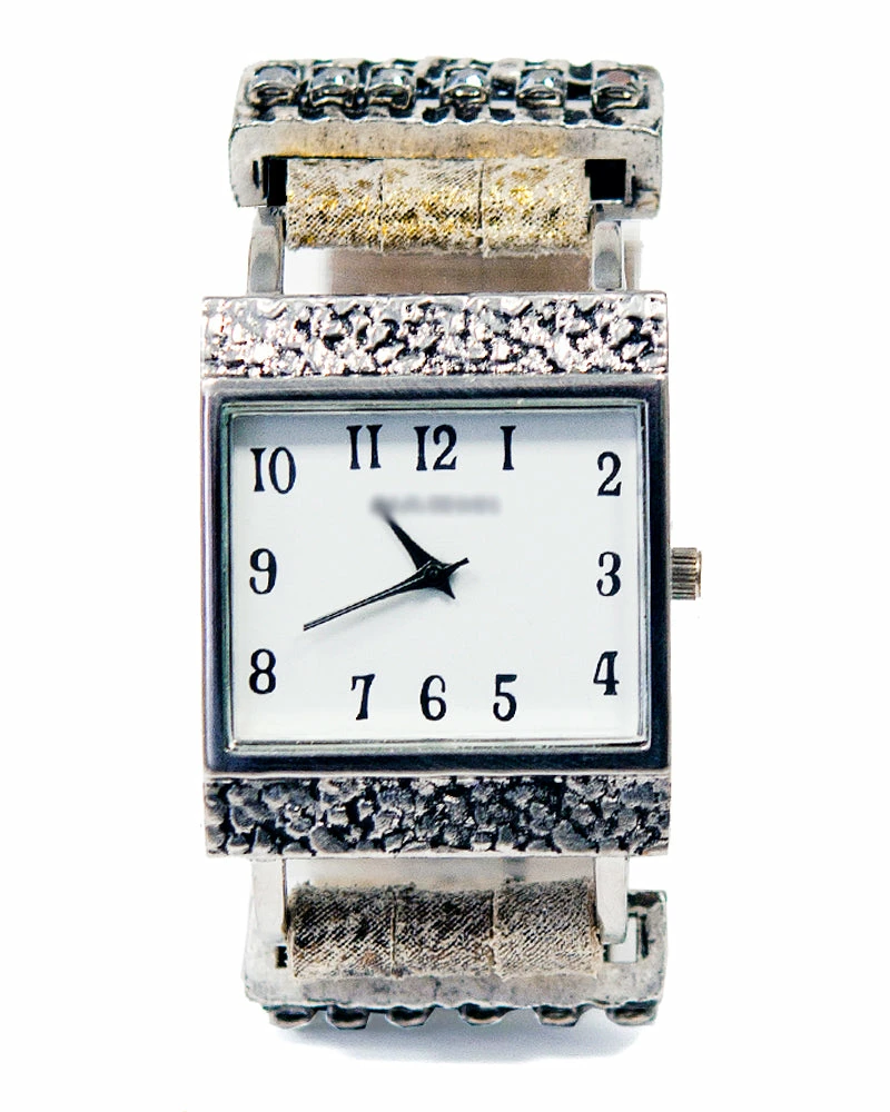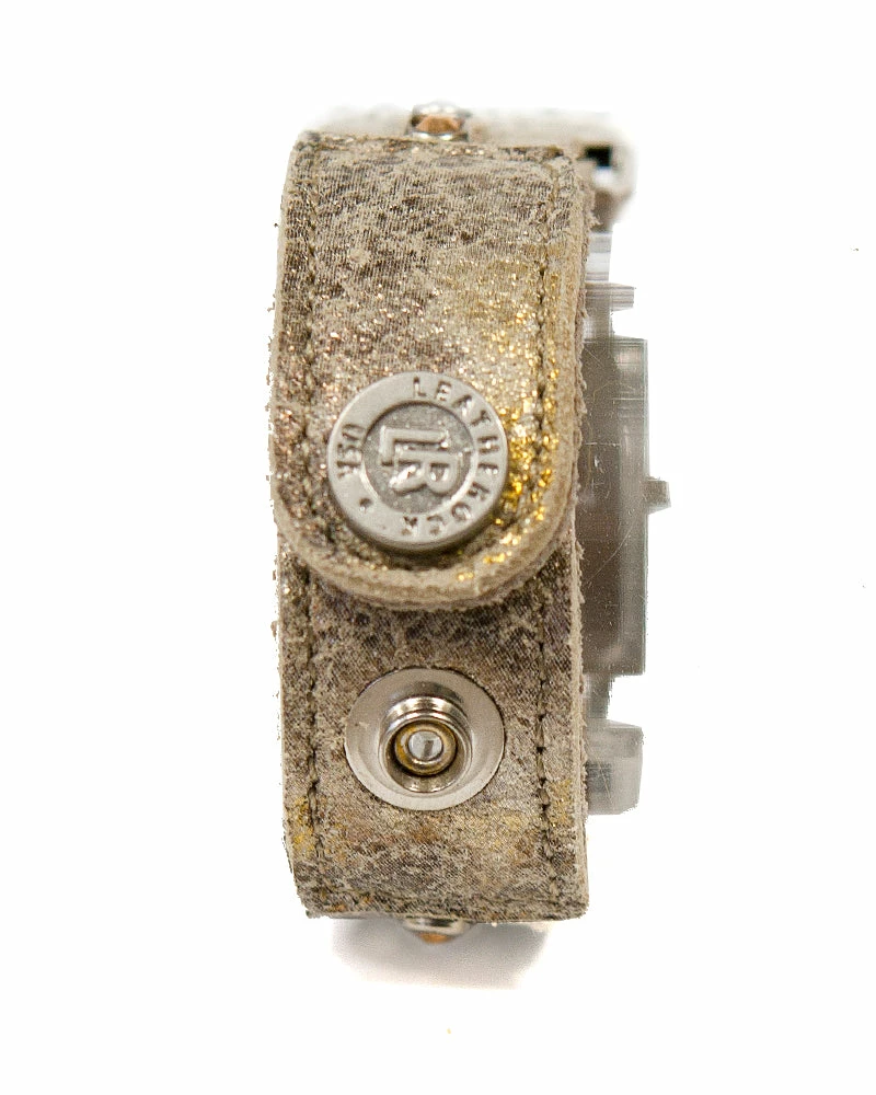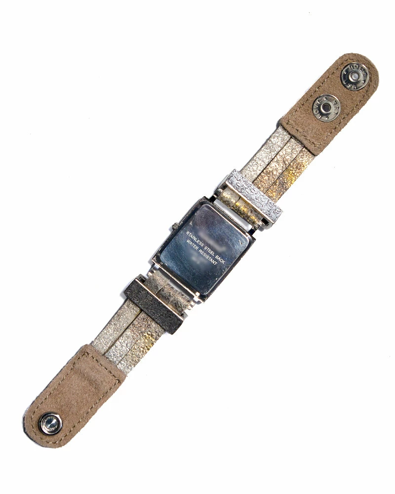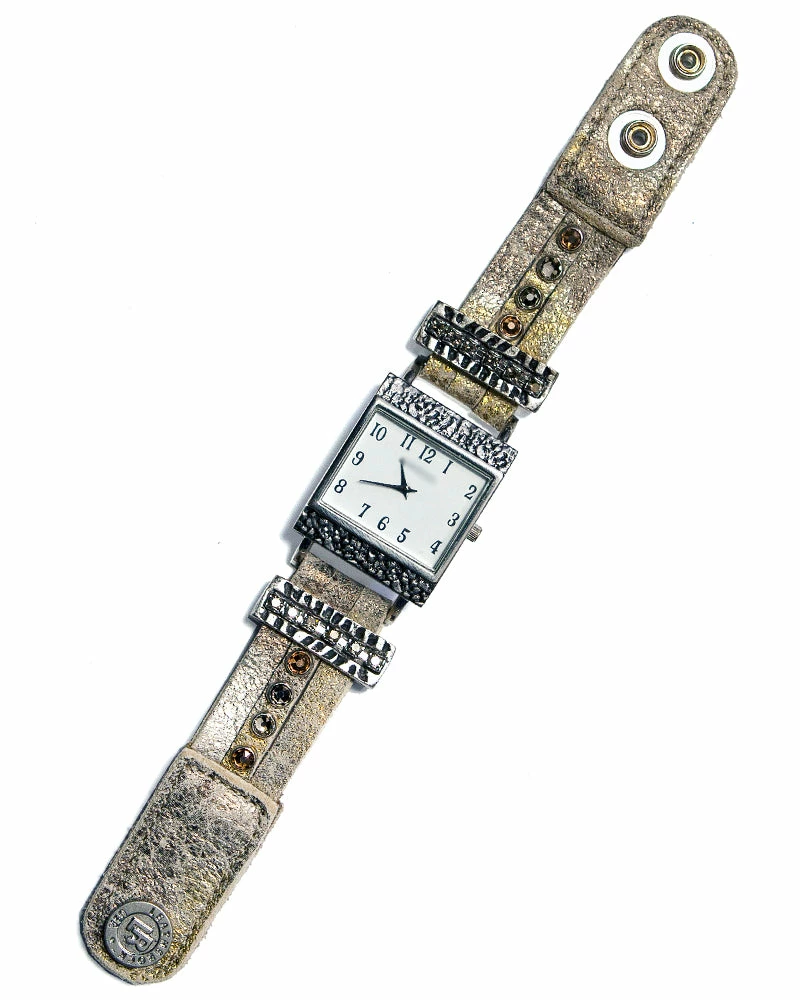 A square watch face centers this metallic leather strap, studded with crystals.Â