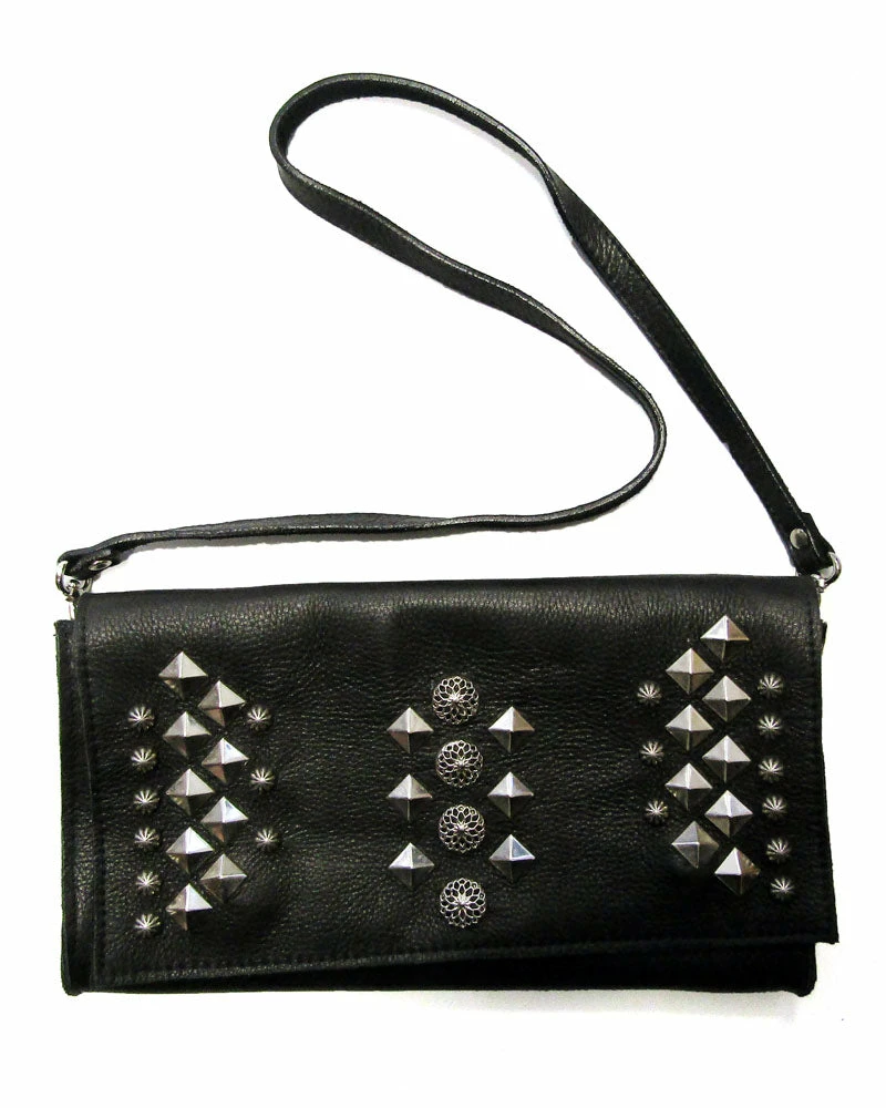 Mixed Silver studs adorn the flap of this soft black clutch.Â
