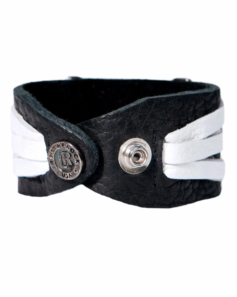 Stone chips are set in antiqued hardware, laced onto a leather cuff.
