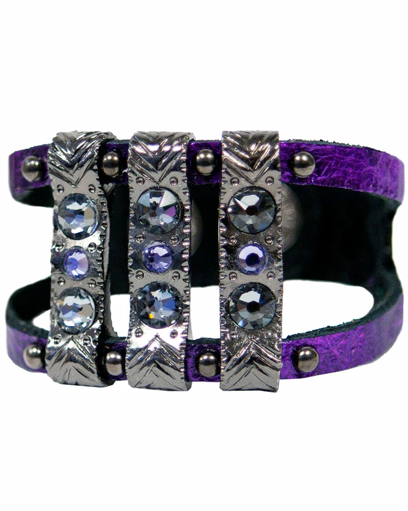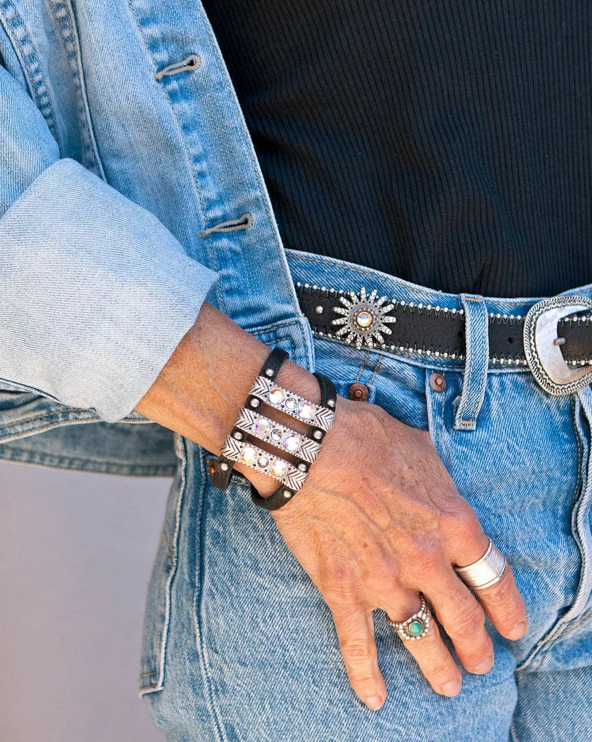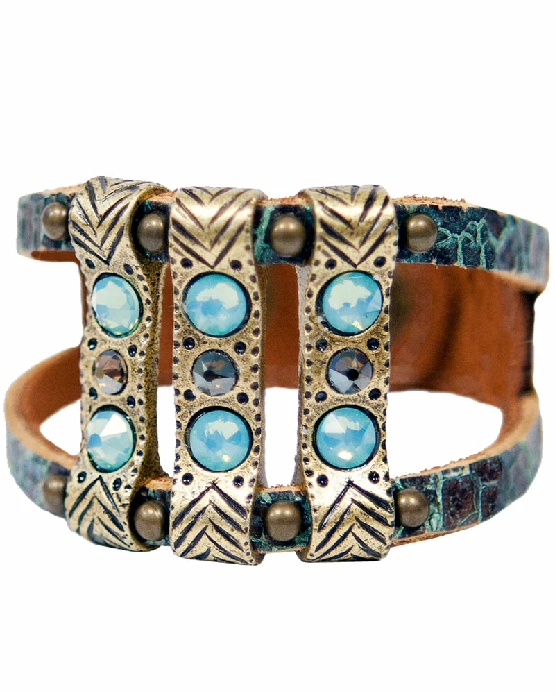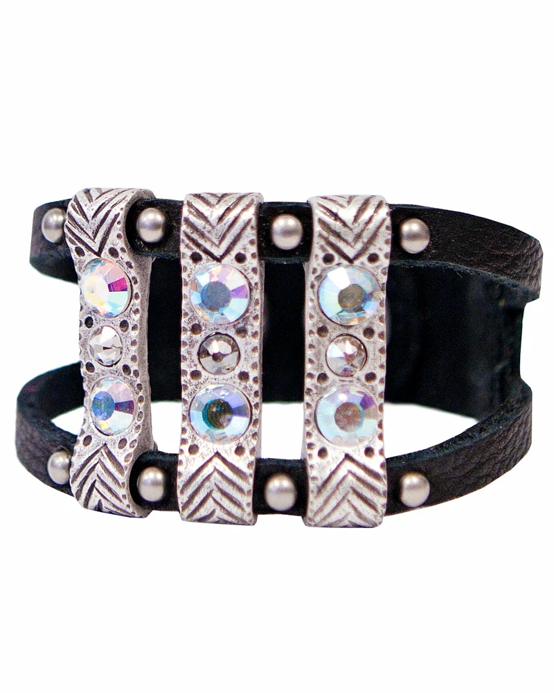 This boho bracelet shows off etched bars and is finished with crystals.