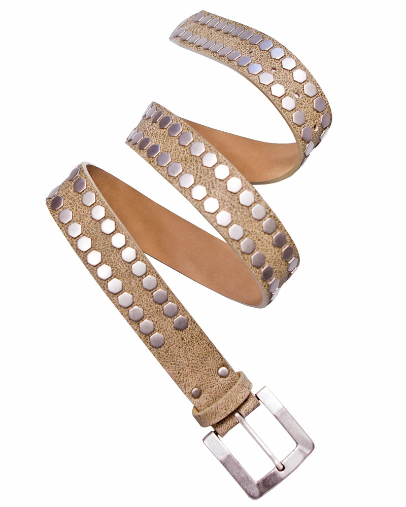 Hexagon studs line a distressed leather strap to make a rugged belt.Â