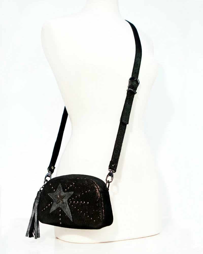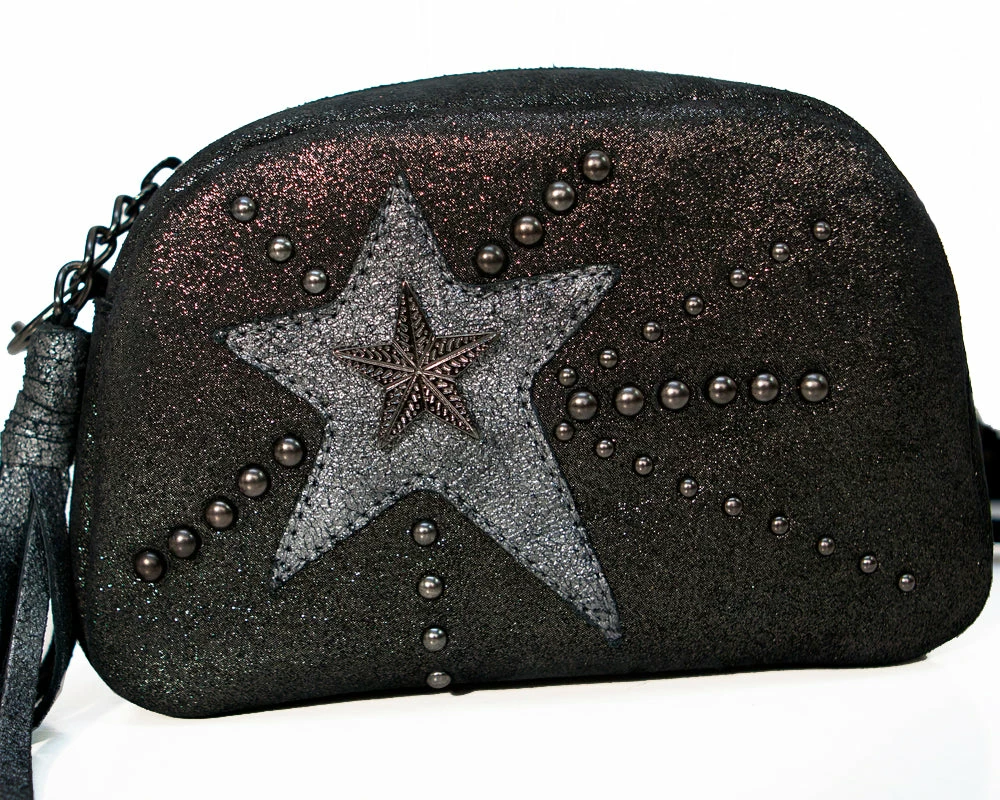 A whimsical star design gives this metallic leather crossbody bag a charming twist.