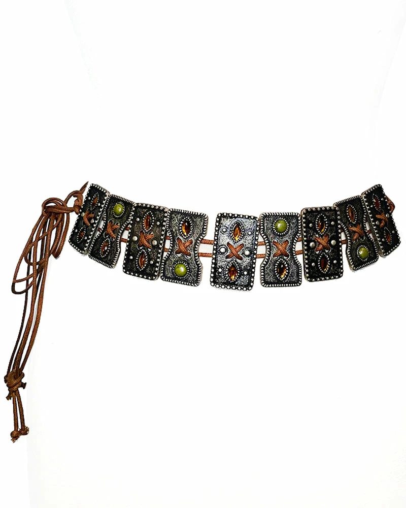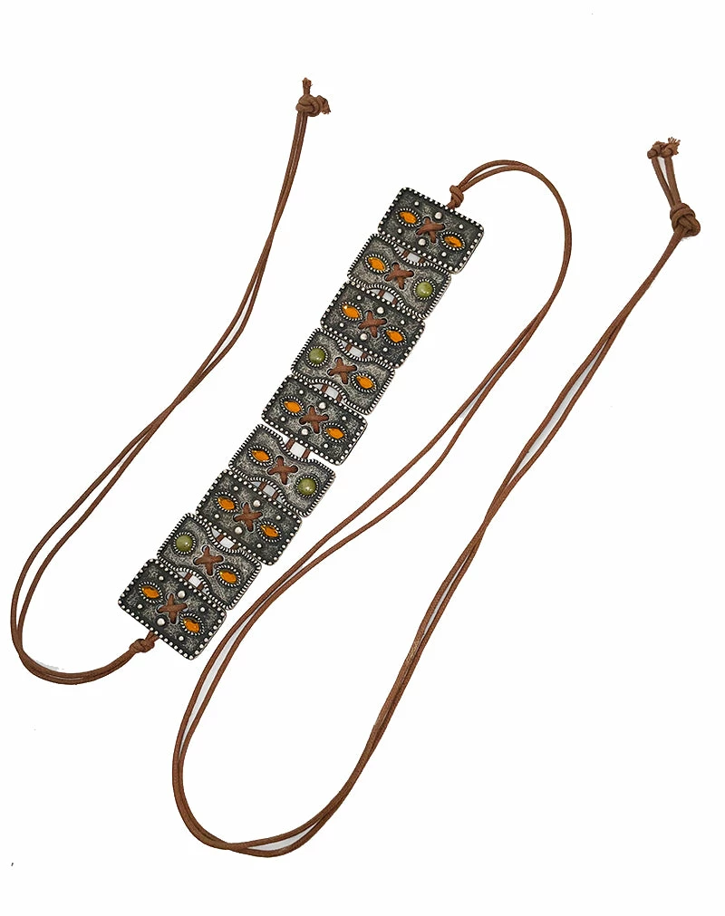 This tie belt is made with unique, embellished slider ornaments with Olive and Topaz colored stones on a brown cotton rope.