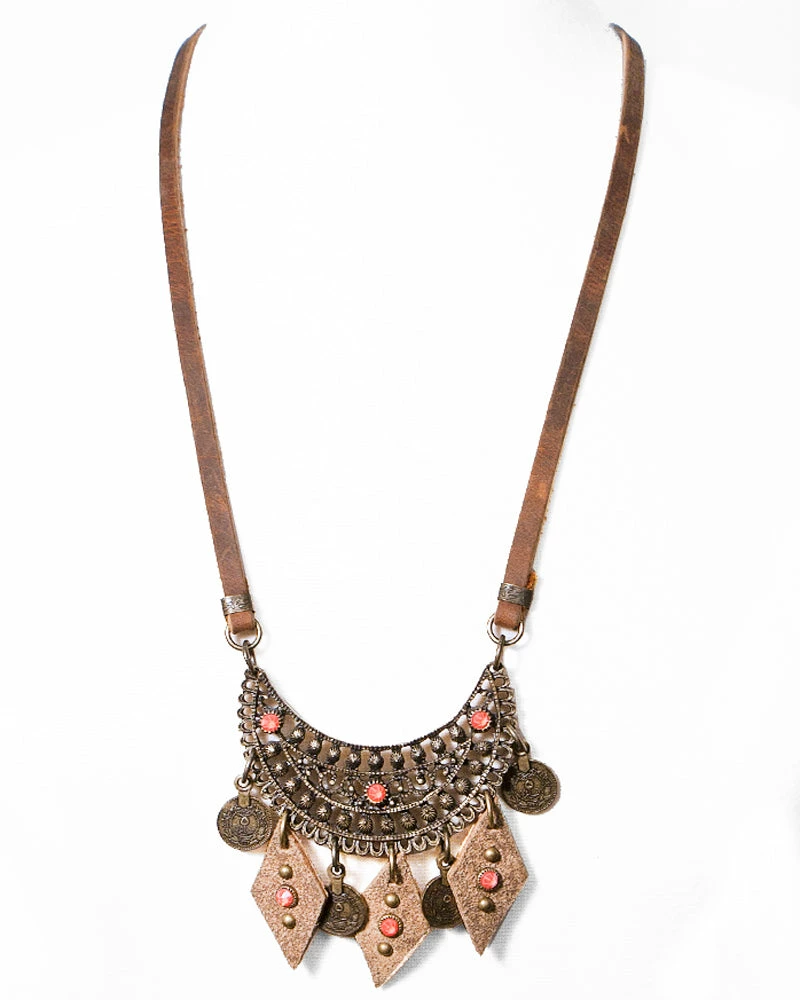 This statement piece brings a pop of color and texture, with distressed leather and coral-colored crystals.Â