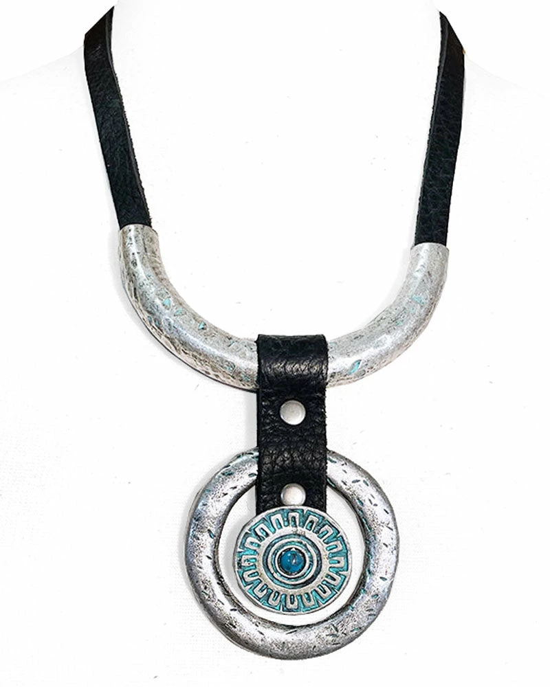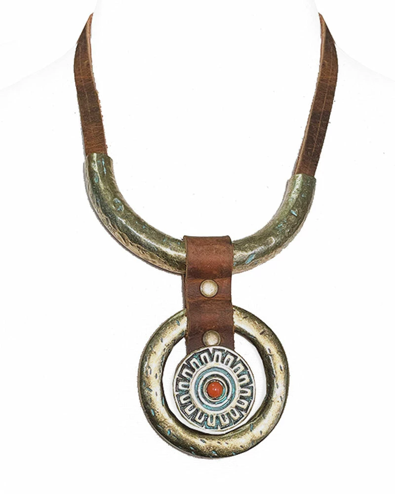 Bold, Hammered metal pieces with large circle etched ornament on raw leather straps.