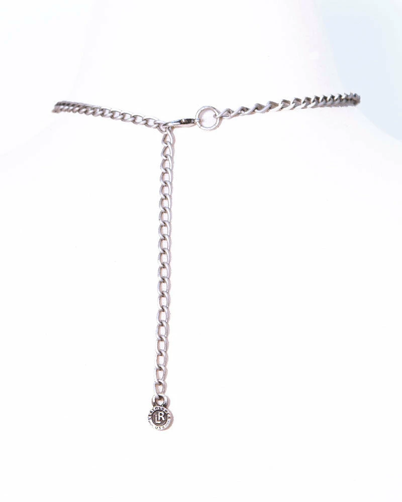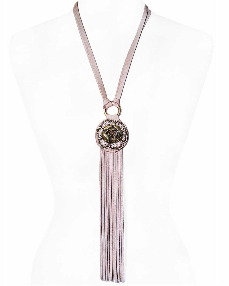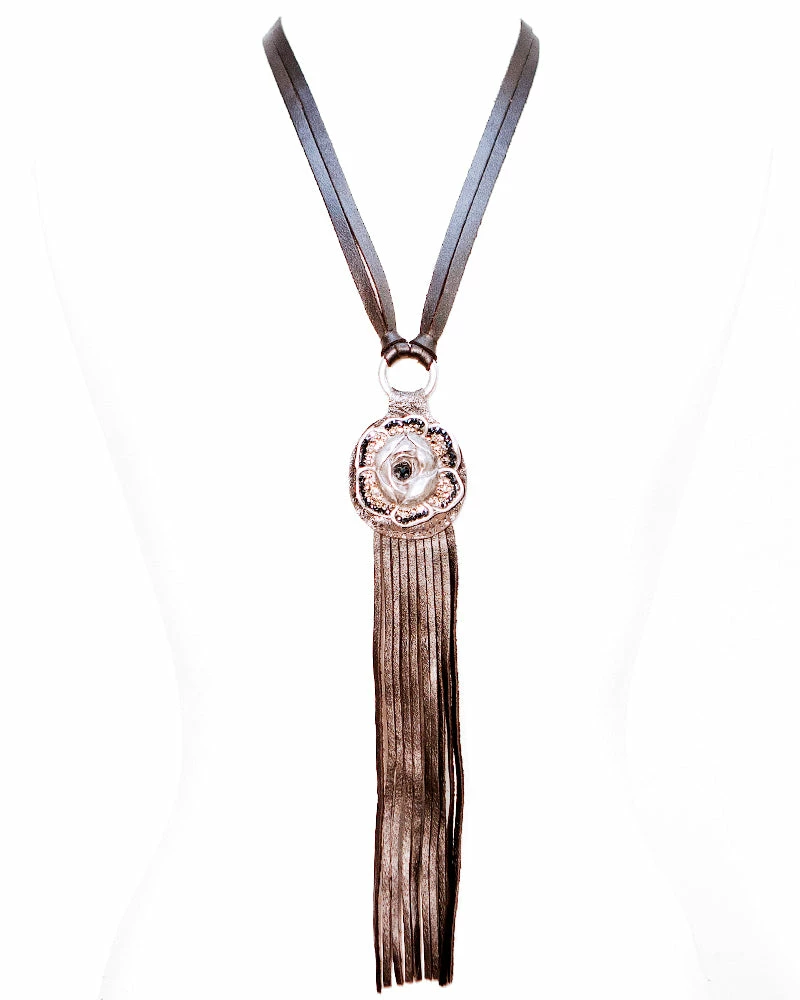 A blooming rose ornament set with sparkling crystals is accented with long, dramatic fringe in leather.