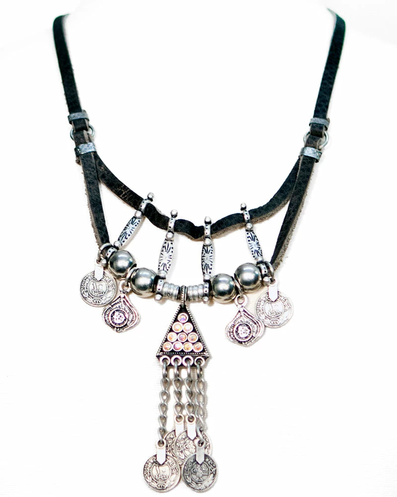 This necklace is all about hardware. Patterned bars and hanging coins bring tribal influence to a beaded leather strand. Crystals add a touch of sparkle.