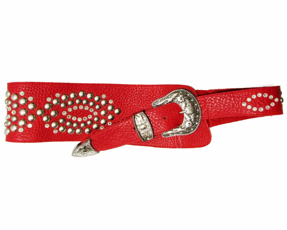 Silver studs adorn this statement red hip belt.Â