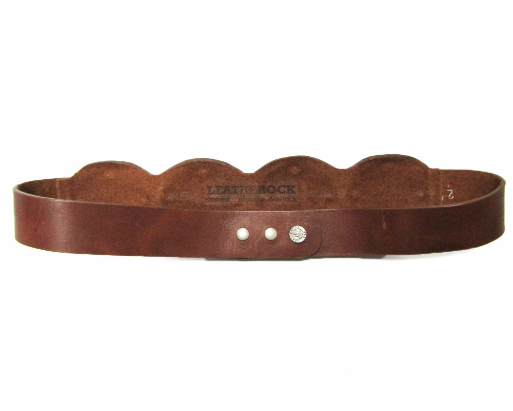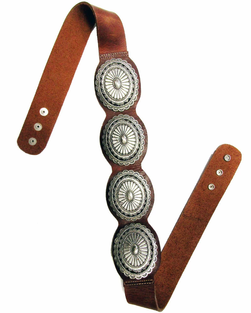 Four large conchos on distressed leather. Adjustable snap closure on back.