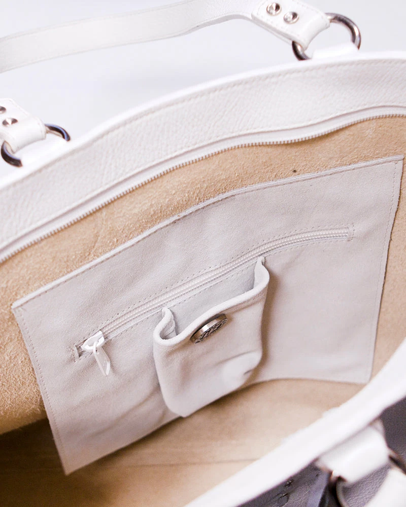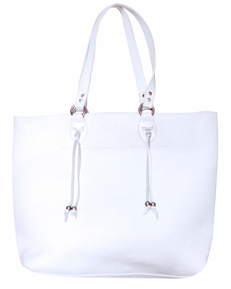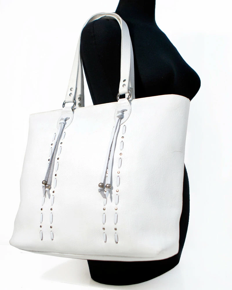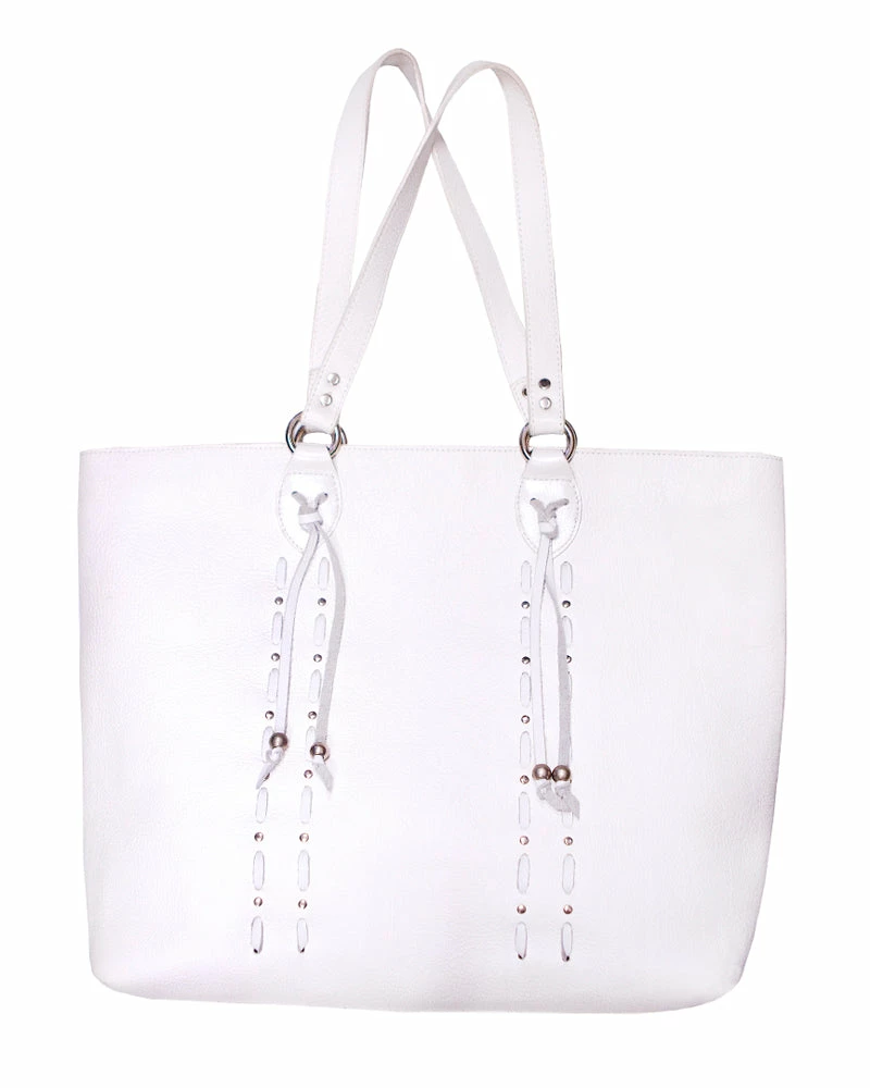 Crisp white leather forms this jumbo tote bag perfect for carrying all of your essentials. Lacing details elevate the style.Â