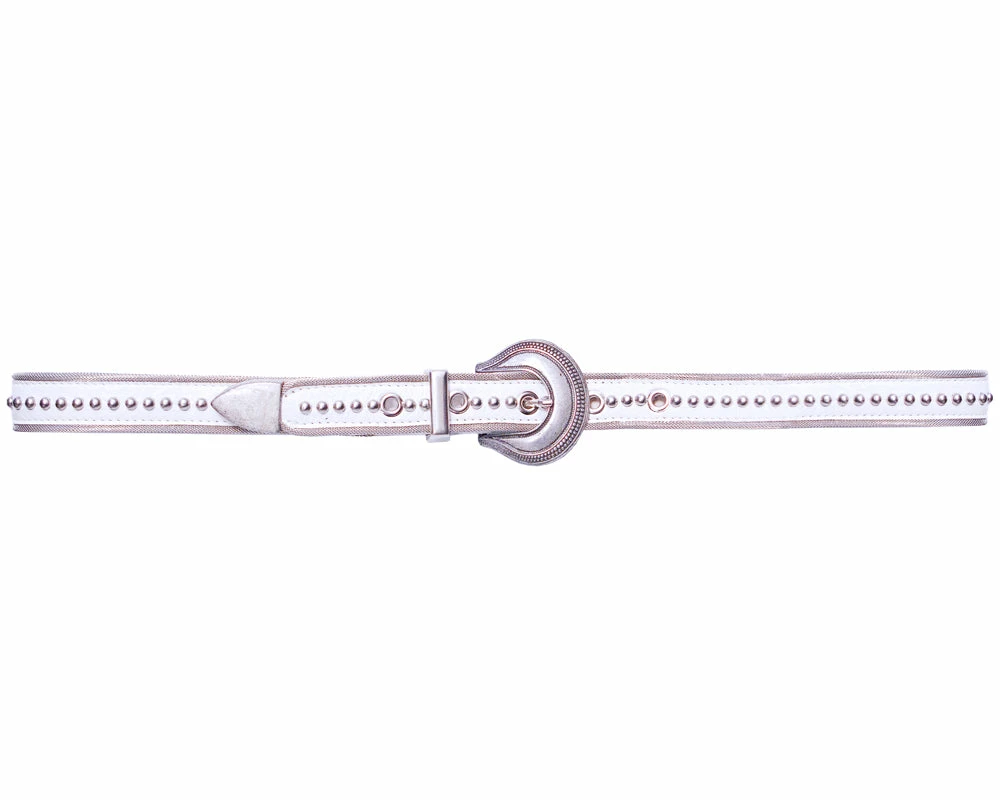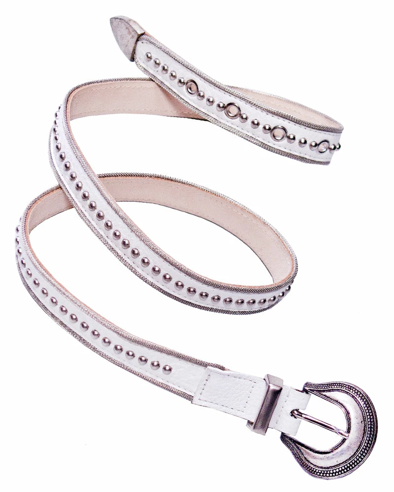 White leather is framed with silver mesh on this skinny studded belt.Â