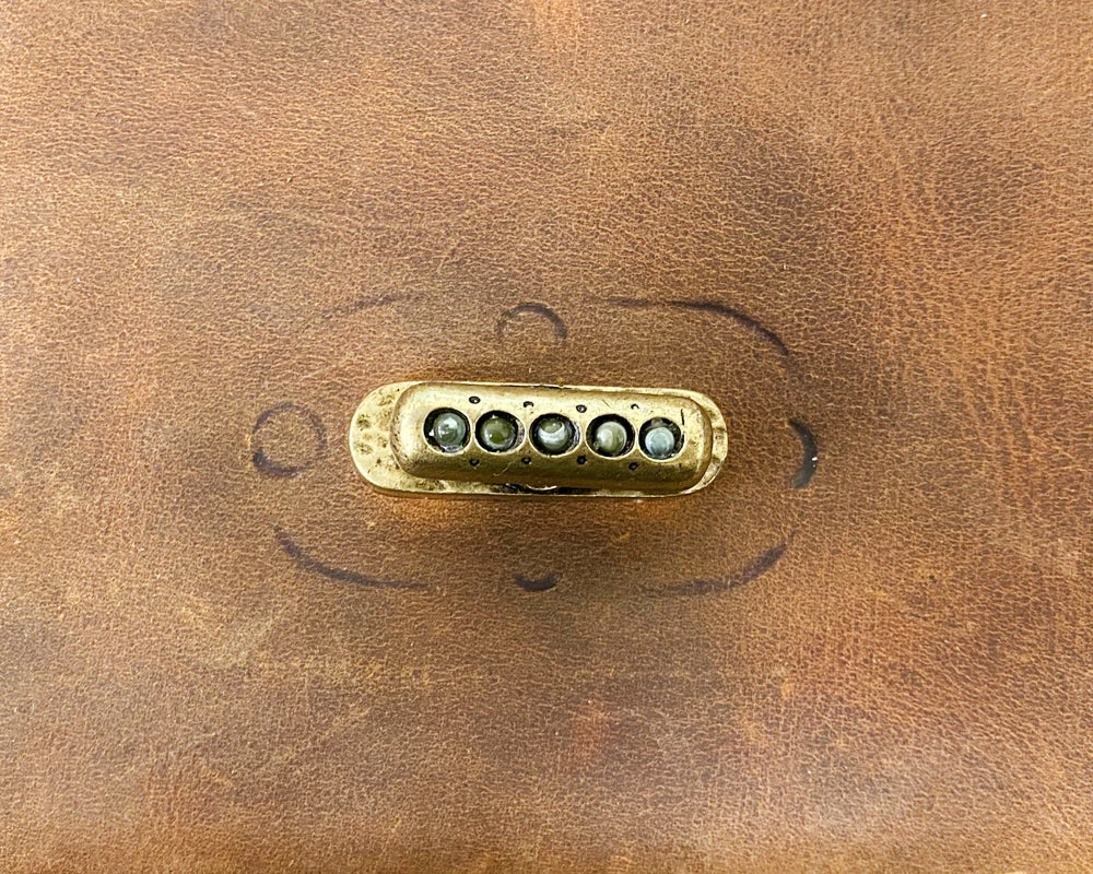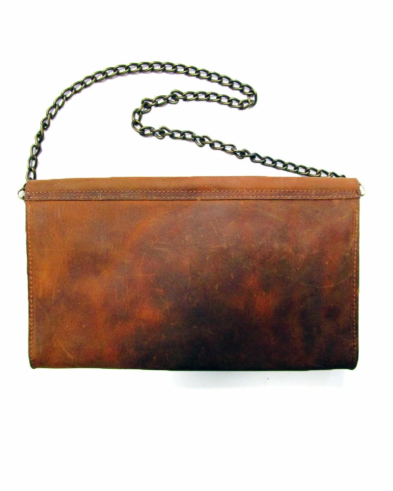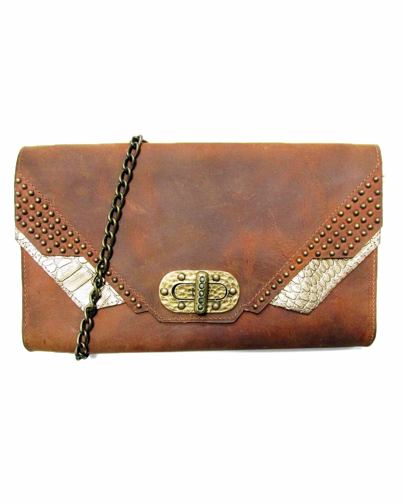 This clutch features metallic leather peeking out from behind brass studs and a turn-lock closure.