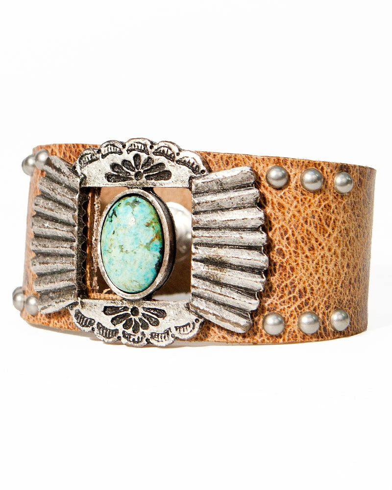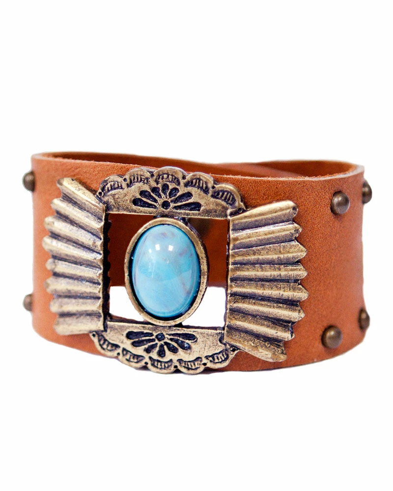 Bring western vibes to your style with this concho bracelet. Studded leather is accented with a beautiful stone centerpiece.