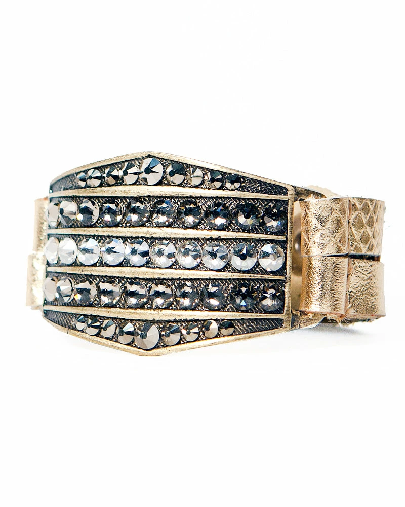 Multi-leather bracelet with center metal bar embellished with rows of crystals.