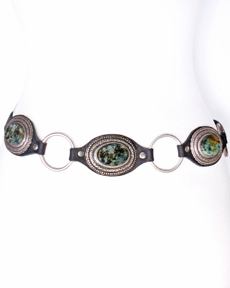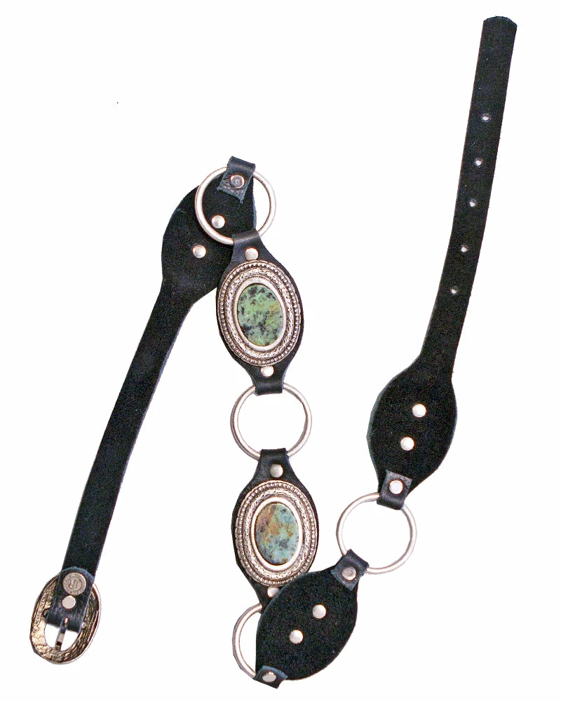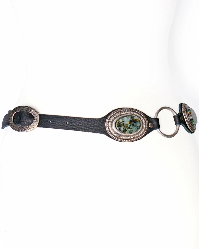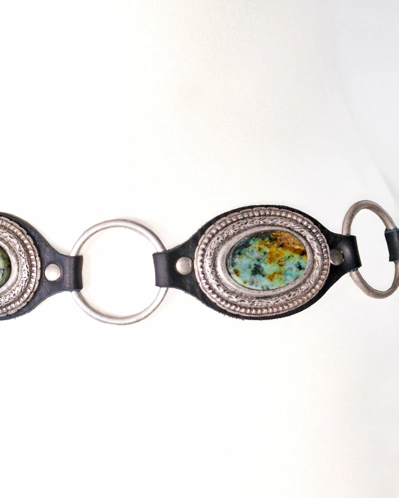 Silver rings are connected by leather stations and accented with African Turquoise stones.Â