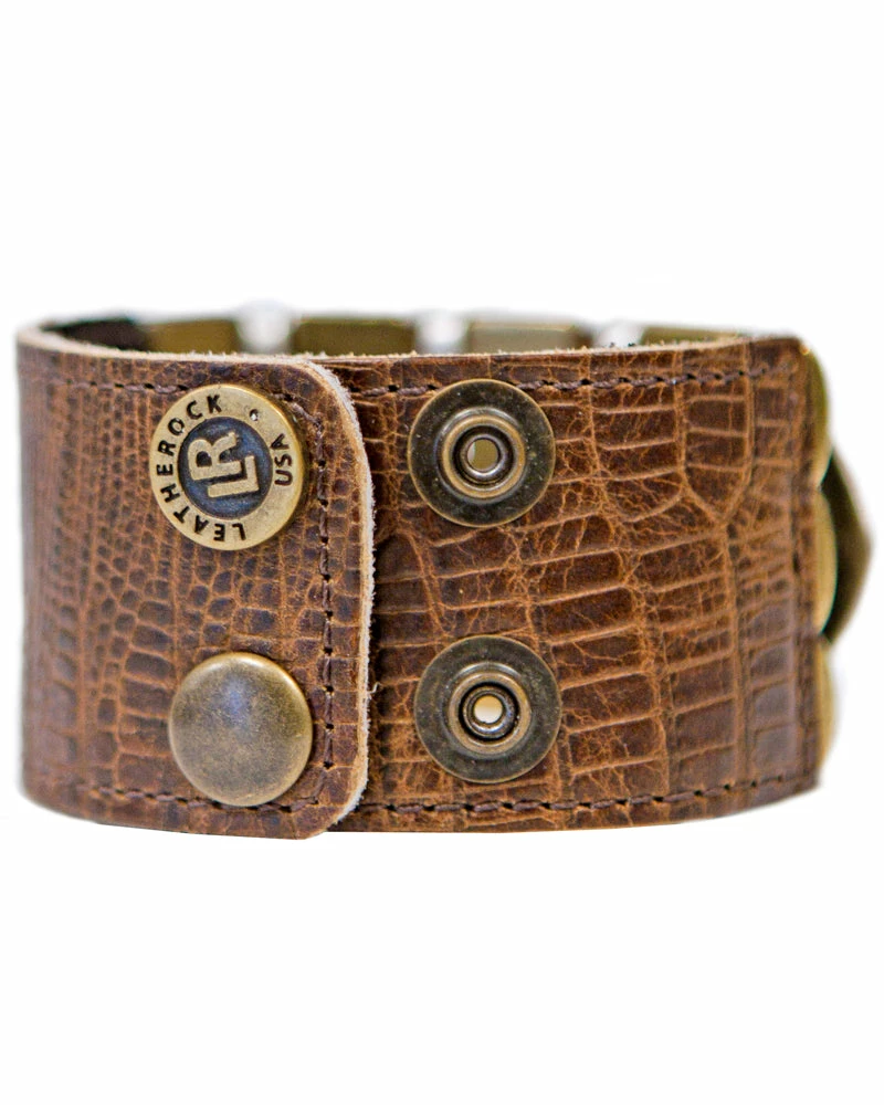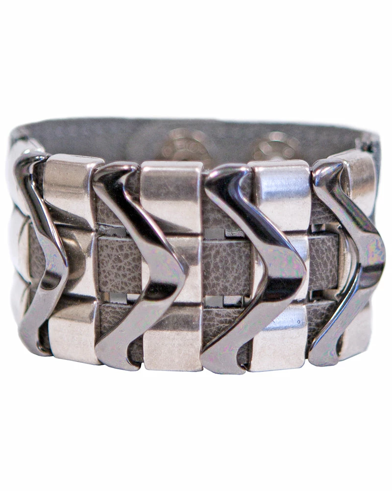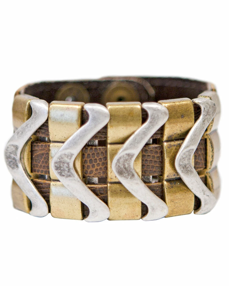 Layered sliders in mixed metals give an edge to this leather cuff.Â