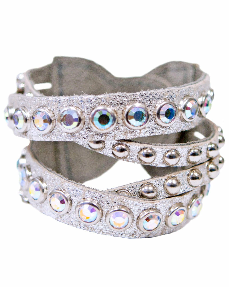 Studs and glittering crystals line strips of leather, finished with a simple button closure.