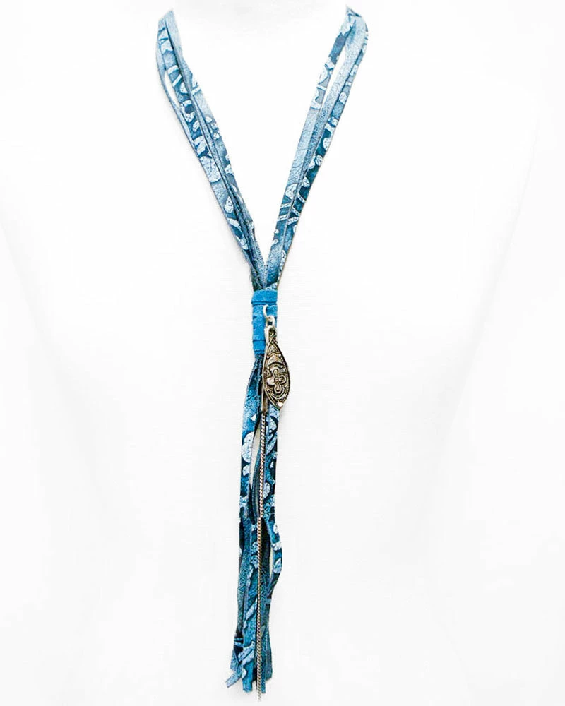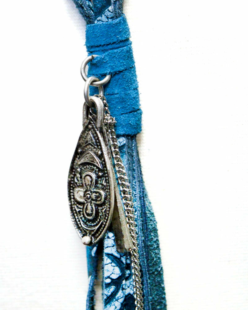 Add a pop of color and texture with this tasseled necklace, featuring blue suede and tooled leather with boho-style ornaments.Â