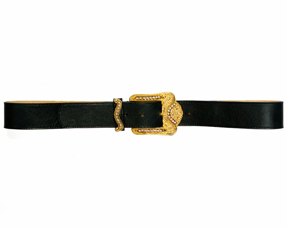 Bright gold hardware pops on this black leather strap. Extra glam is added with small crystals set into the buckle and loop.Â