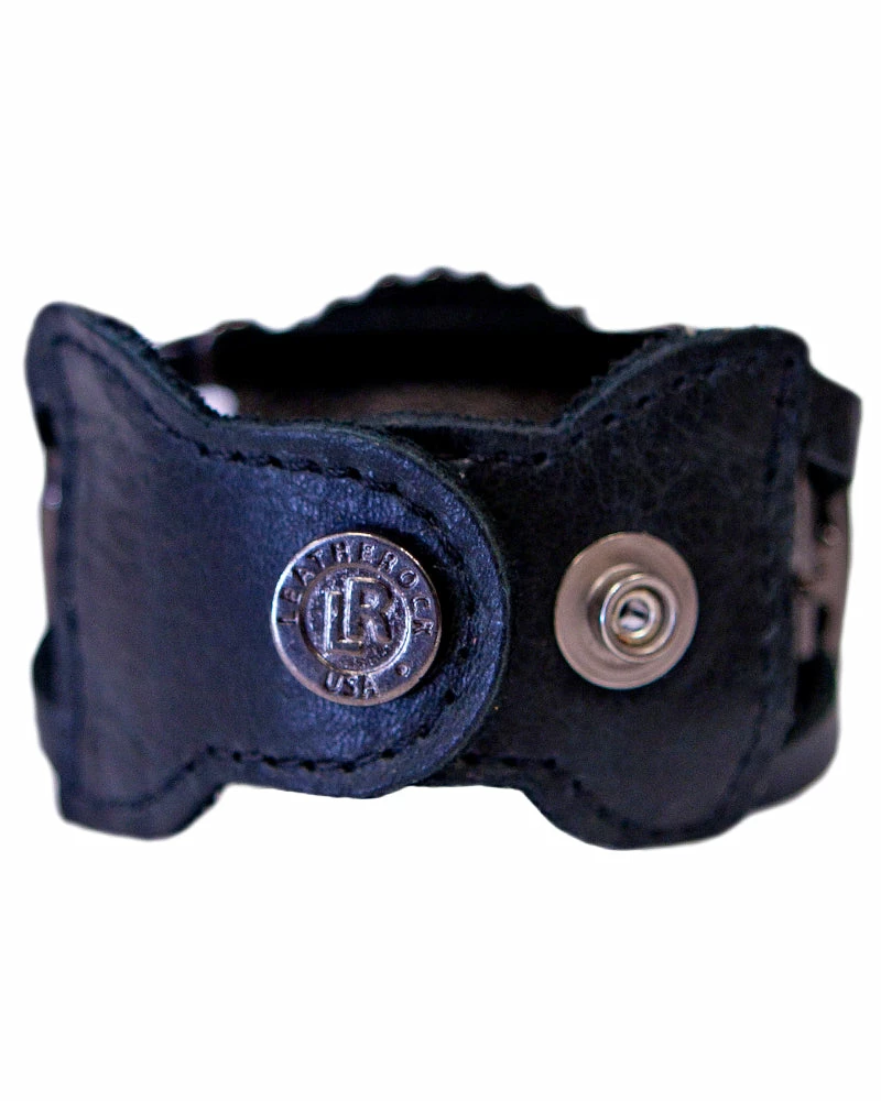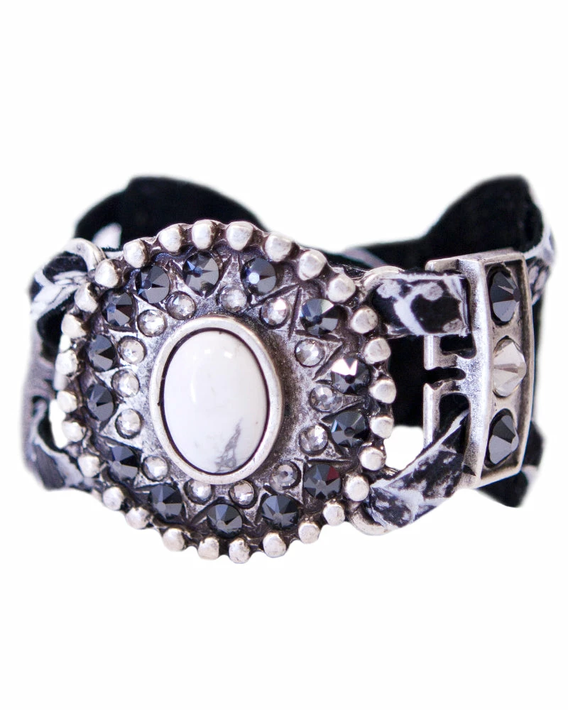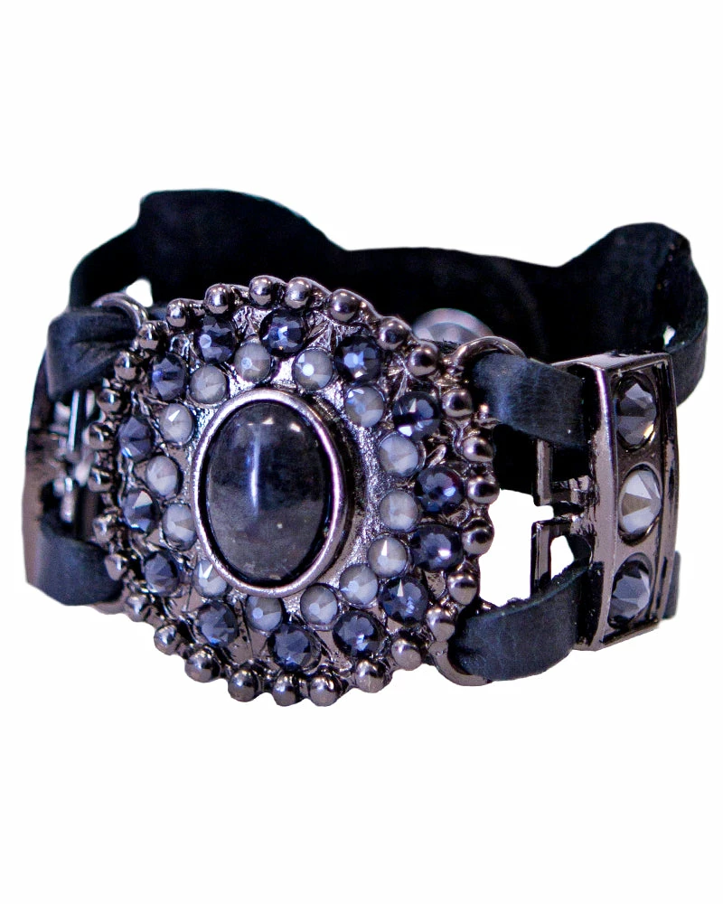 Two leather strips weaved through metal sliders and center ornament adorned with a semi-precious stone and Crystals.Â