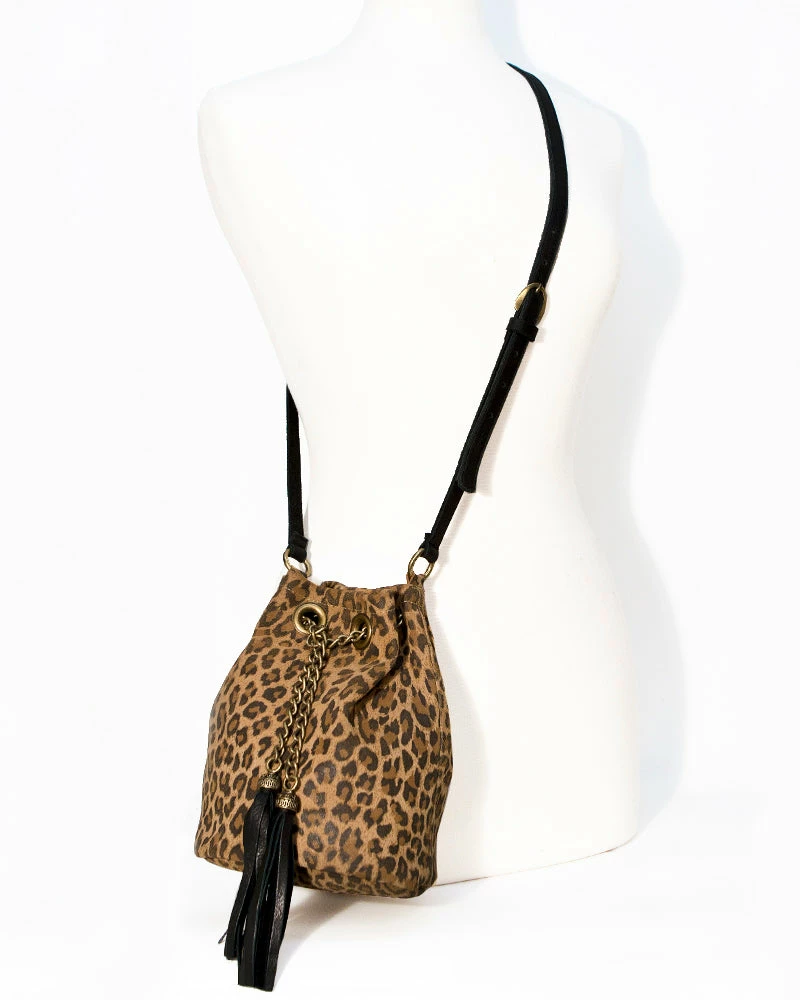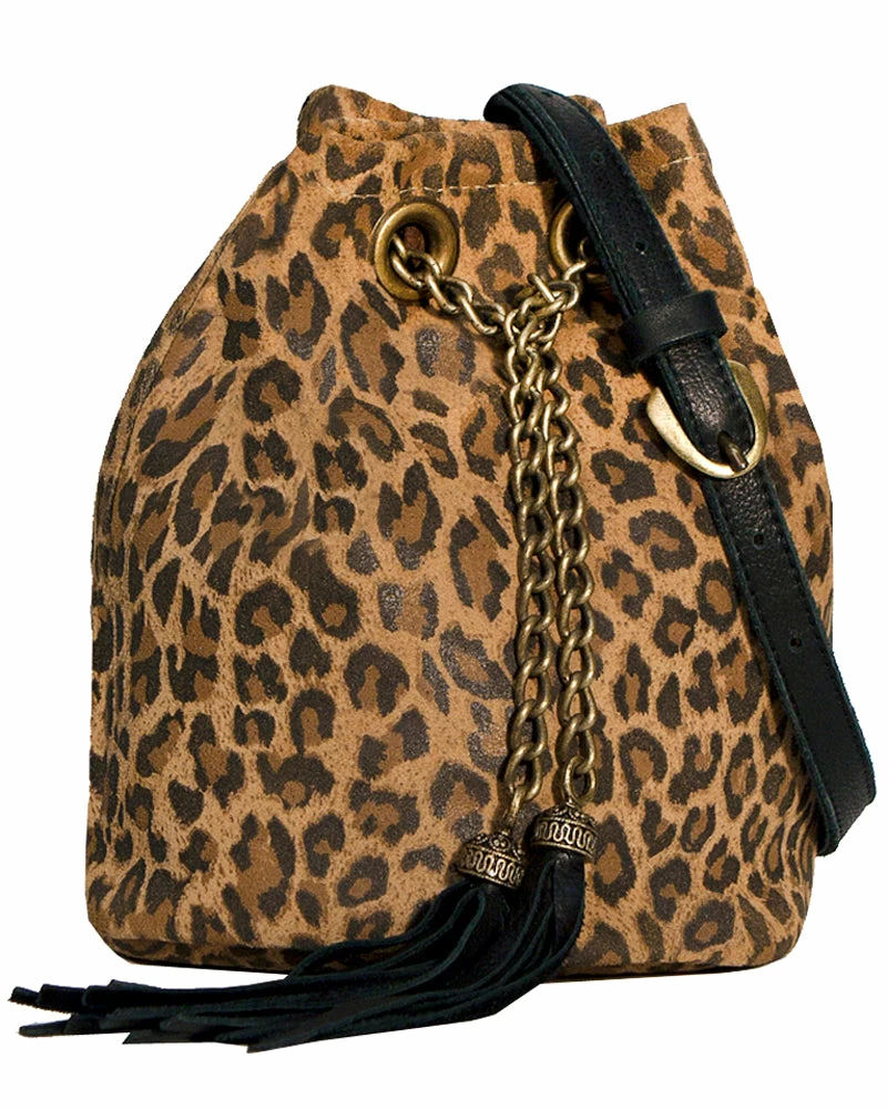 This lightly structured bucket bag features chain drawstrings. Leo print and long tassels add an extra touch of fun.