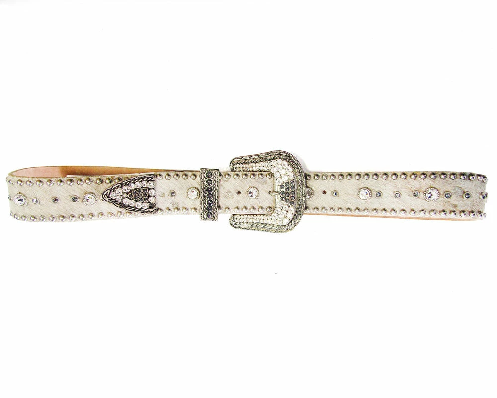 Silver-tinged hair leather is lined with studs and crystals, finished with a sparkling buckle, loop and tip set.Â