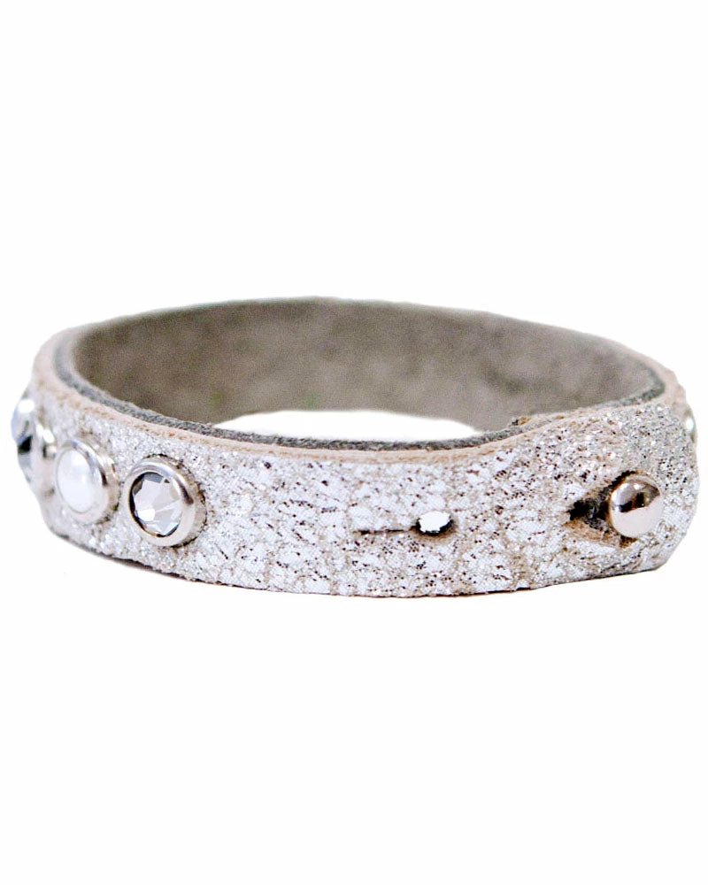 Multi-color crystals are glinting from their settings on this slender leather bracelet.