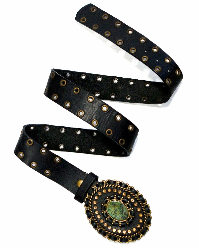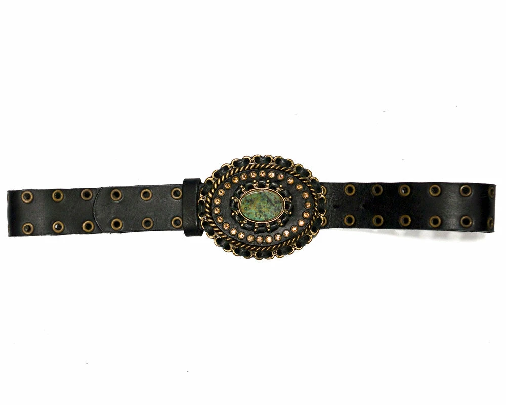An oversized buckle is adorned with leather, crystals and an African Turquoise stone.
