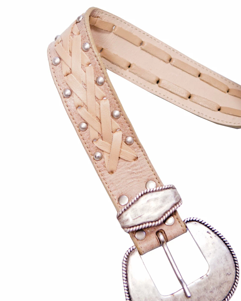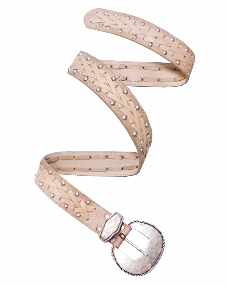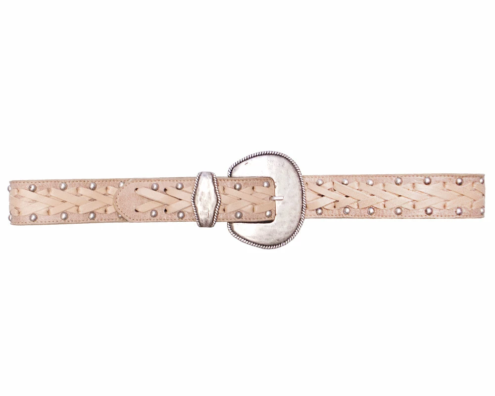 Strips of leather are laced along a soft strap and framed with studs. Finished with a decorative buckle and loop set.
