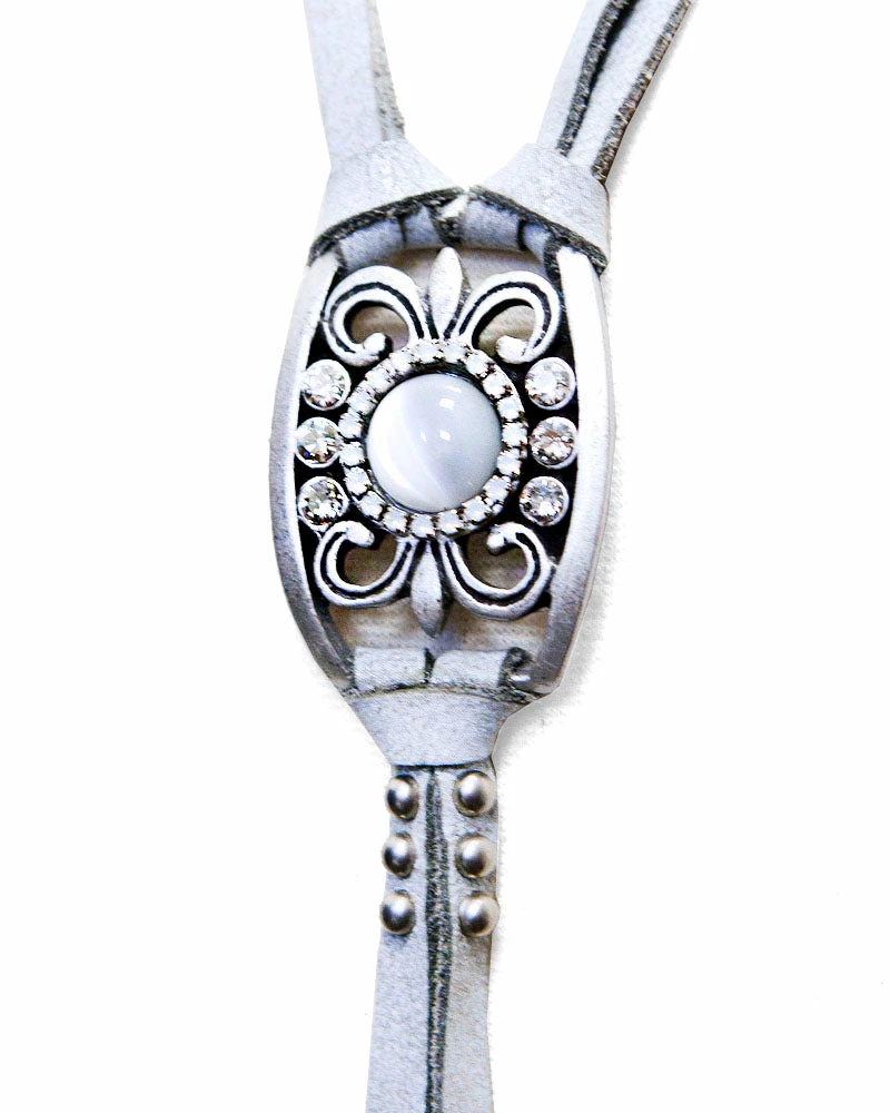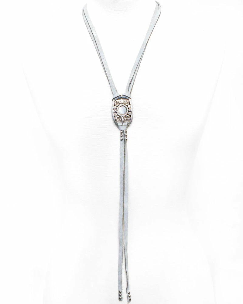 Inspired by bolo ties, this long necklace is made out of soft leather, with a crystal ornament knotted in the middle.Â