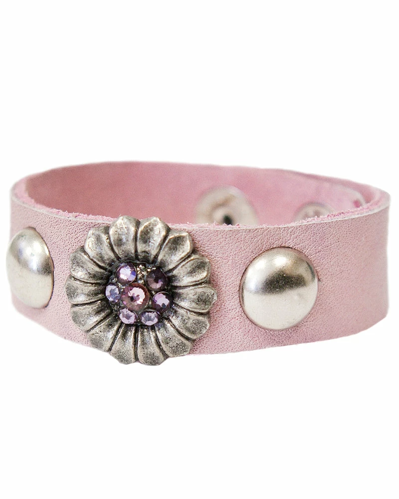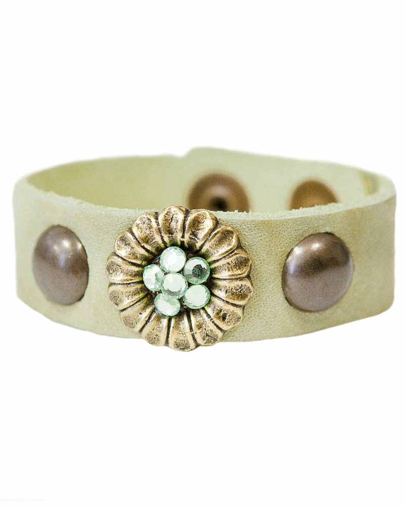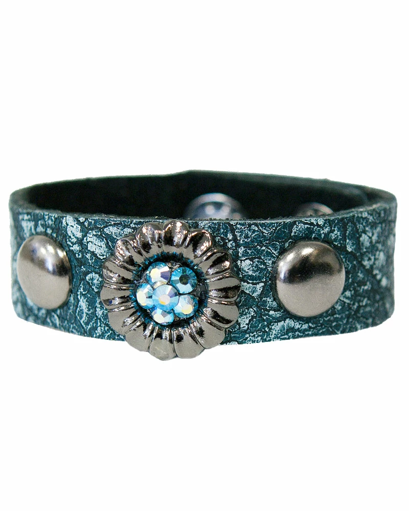 A tiny sunflower with sparkling crystals sits on a soft strip of leather.