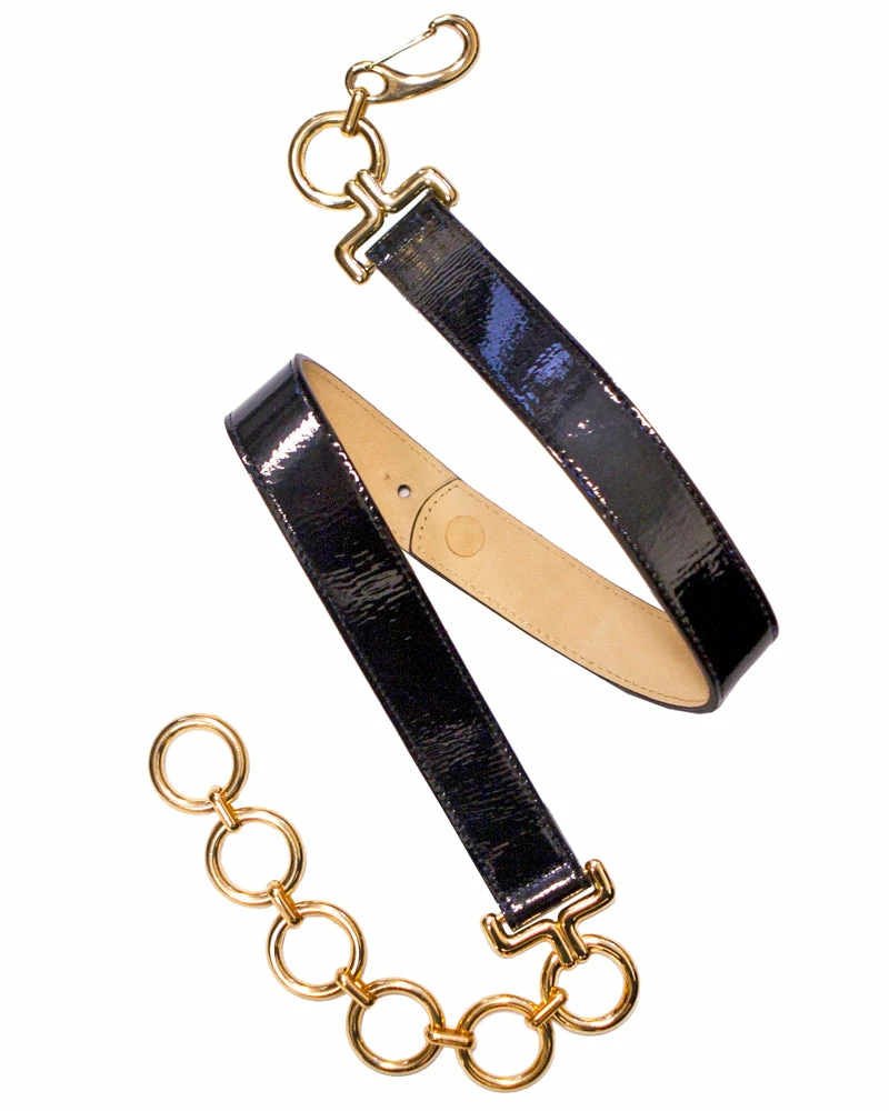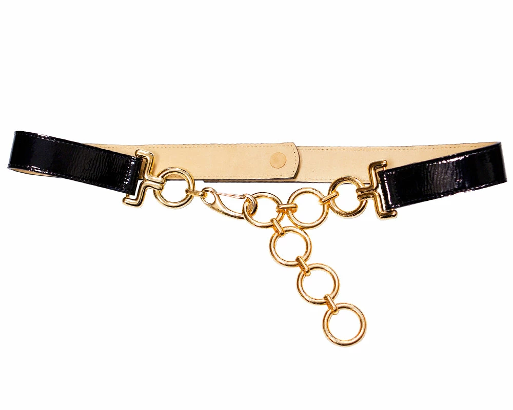 Sleek and sophisticated, this patent black leather belt features a polished gold hook closure.Â