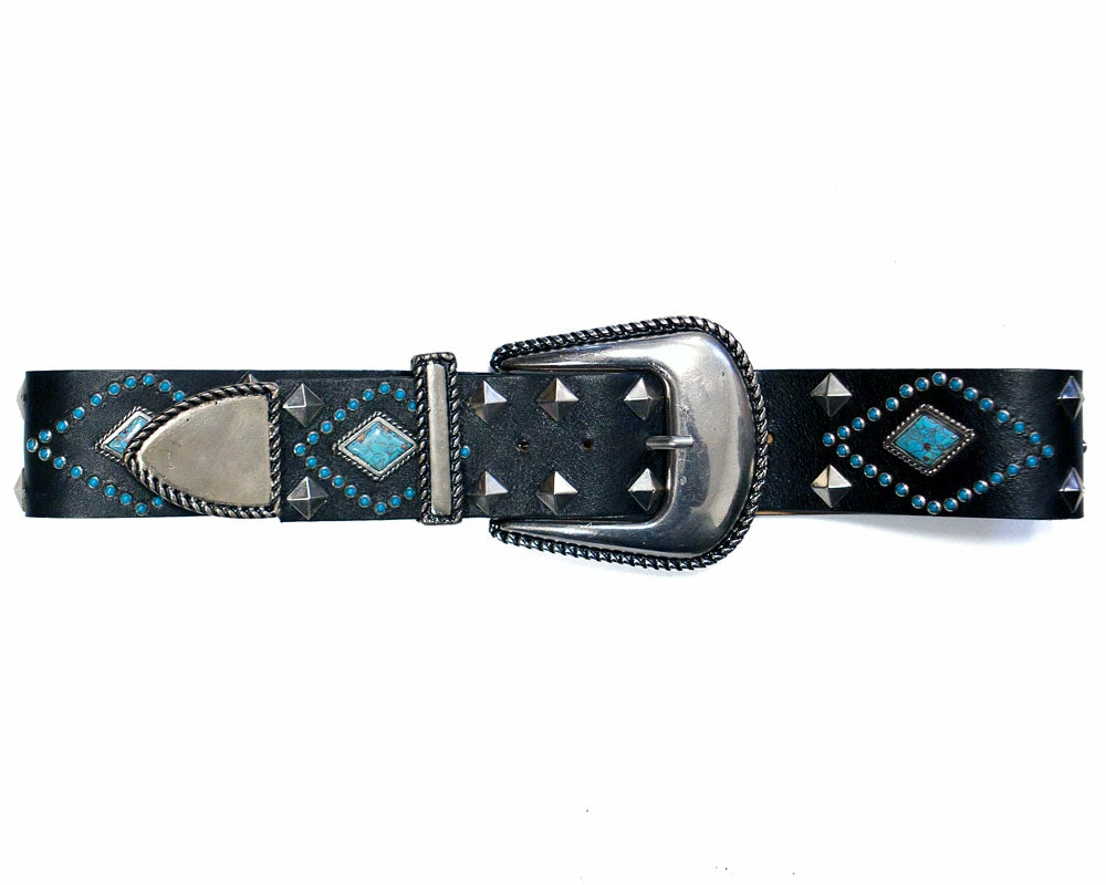 An oversized buckle compliments western-inspired decorations on this belt.Â