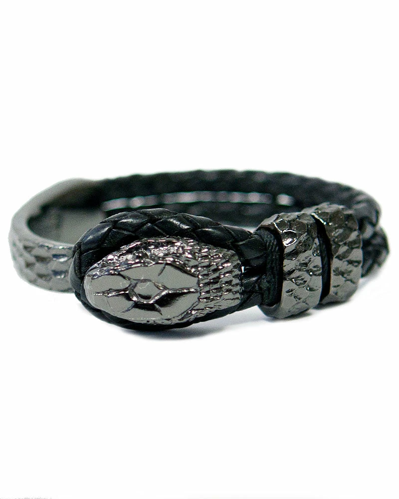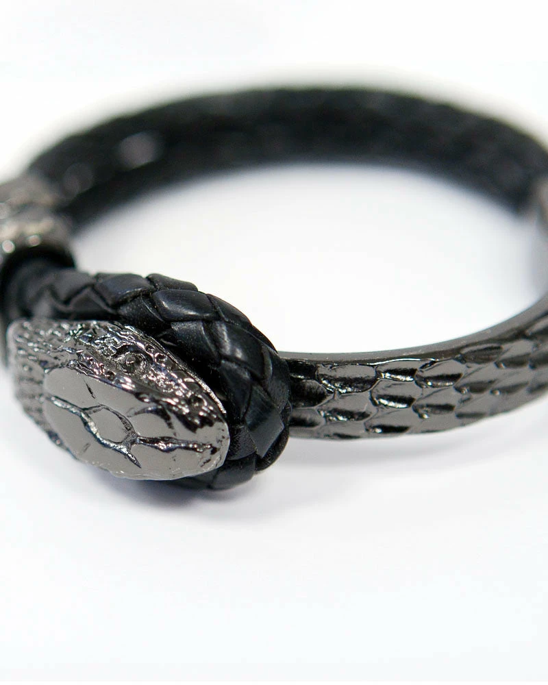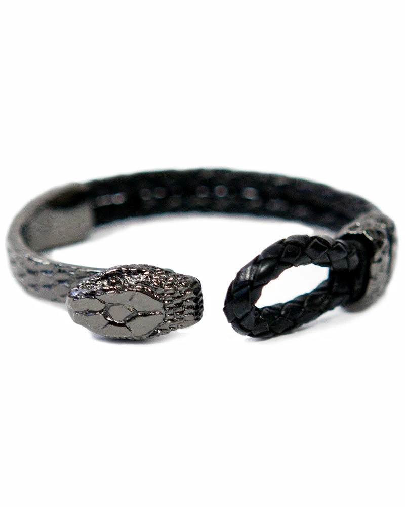 Snake-printed hardware and a snake head hold this black braided bracelet closed.Â