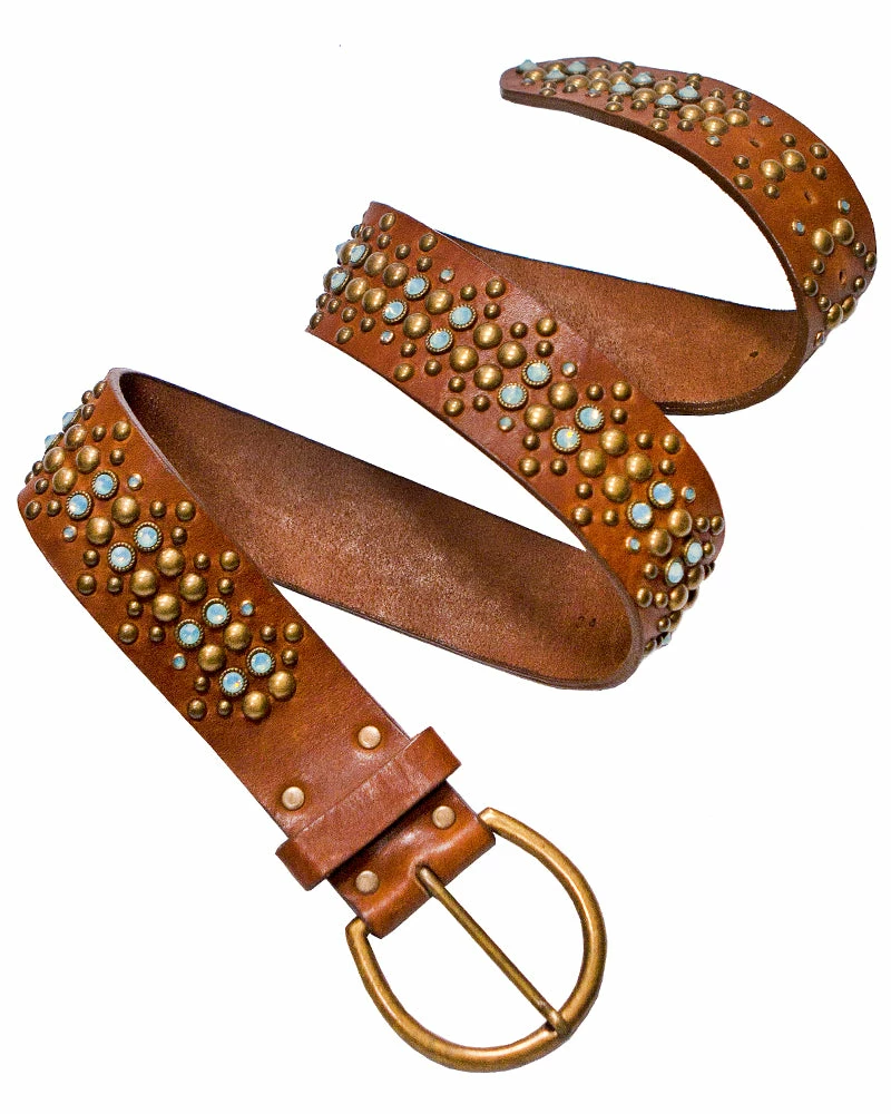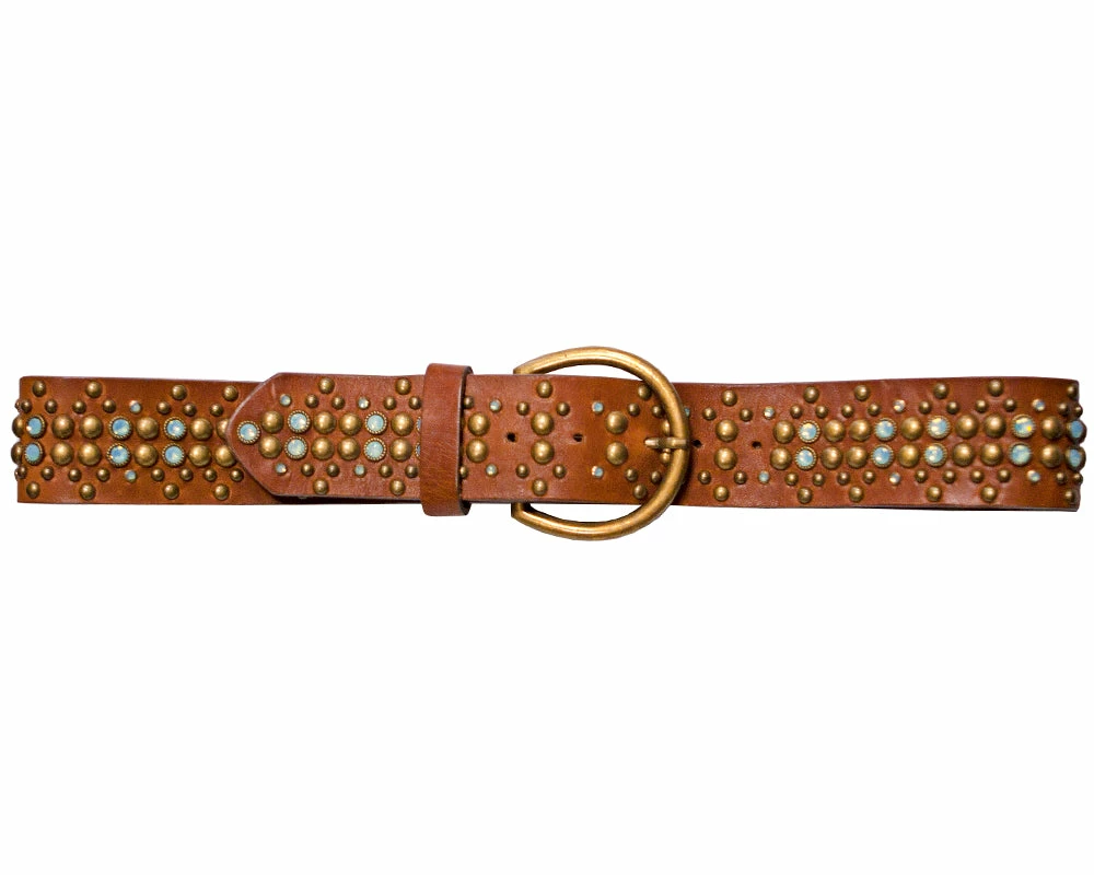 Blue opal crystals and brass studs line this rich brown leather belt.Â