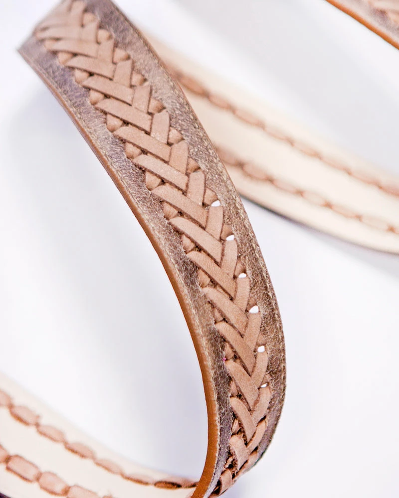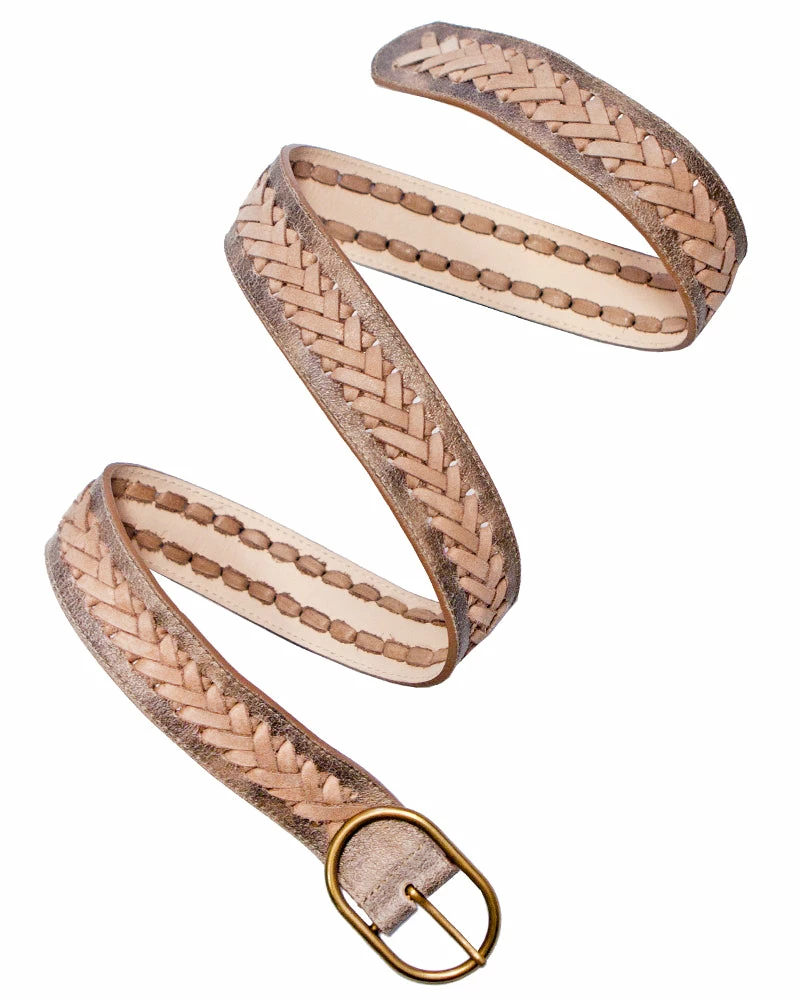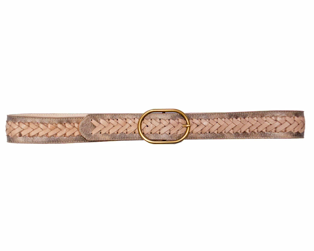 Soft leather is hand-woven through the metallic strap of this jean belt. A simple buckle lets the lacing be the focus.Â